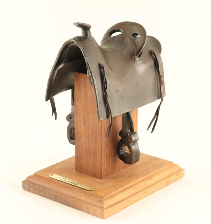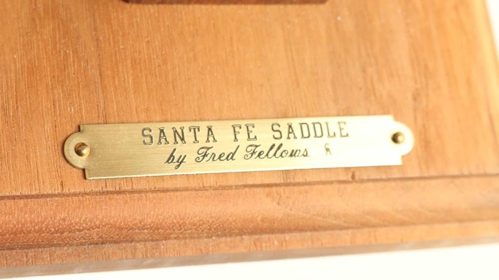 by Fred Fellows entitled Santa Fe Saddle, #39/100, signed, 5"x6"x8". BIO- Fred Fellows had early exposure to ranching and Otoe and Osage Indian reservations. As an artist, he is self-taught, and earned membership (and in 1997 presidency) of the Cowboy Artists of America. Fred Fellows grew up in California where he worked as a cowboy and apprenticed for four years to a saddle maker. Later attended Art Center School in Los Angeles and began a successful career in the aircraft industry. In 1964, he moved his family to Big Fork, Montana to devote himself to painting, while also spending his spare time roping for the big Montana cow outfits.