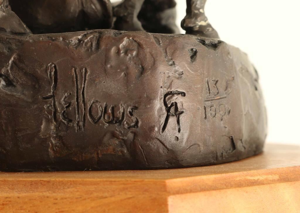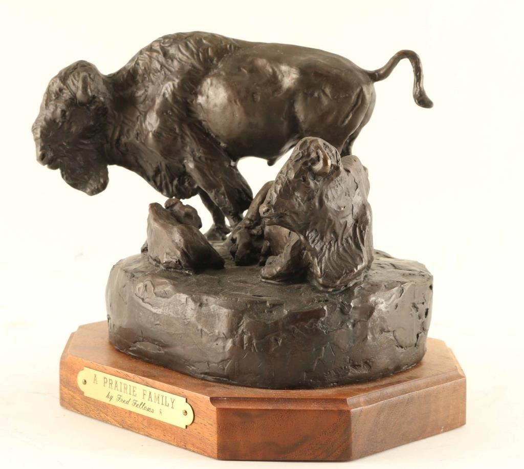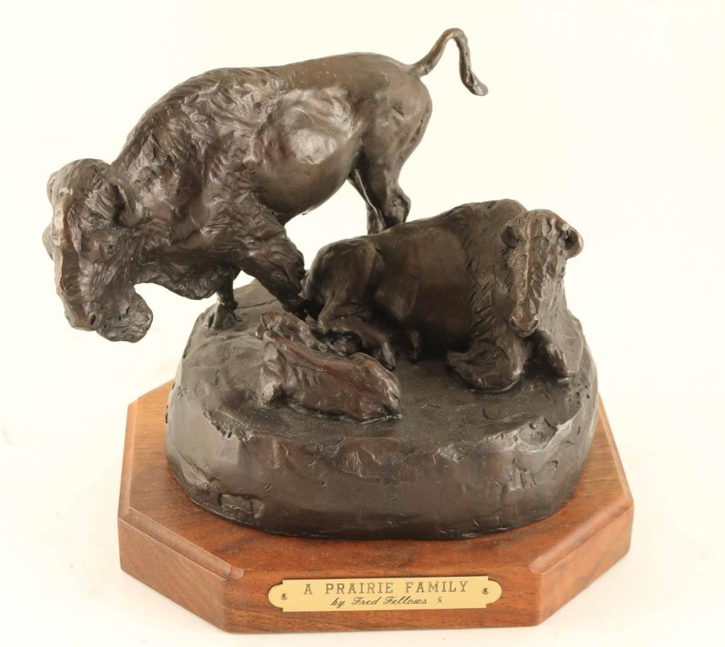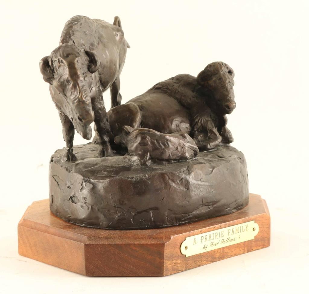 by Fred Fellows entitled "A Prairie Family", #13/100, measures 6"X7"X7". BIO- Fred Fellows had early exposure to ranching and Otoe and Osage Indian reservations. As an artist, he is self-taught, and earned membership (and in 1997 presidency) of the Cowboy Artists of America. Fred Fellows grew up in California where he worked as a cowboy and apprenticed for four years to a saddle maker. Later attended Art Center School in Los Angeles and began a successful career in the aircraft industry. In 1964, he moved his family to Big Fork, Montana to devote himself to painting, while also spending his spare time roping for the big Montana cow outfits.