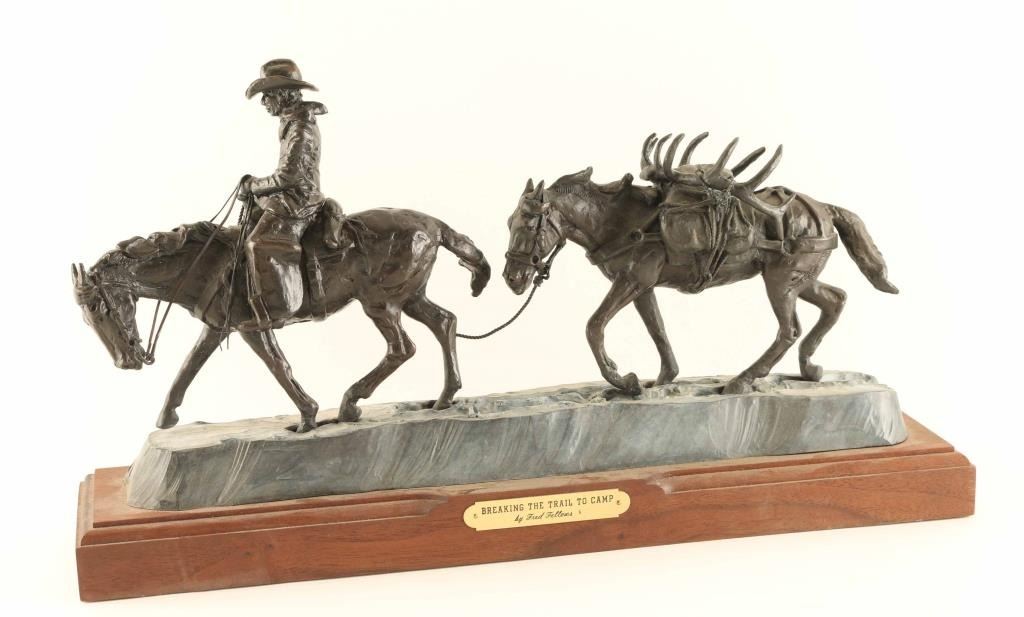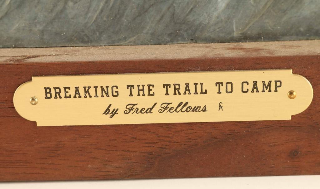 by Fred Fellows entitled "Break the Trail to Camp", #48/100, signed in bronzes measures 4"x19"X10". BIO- Fred Fellows had early exposure to ranching and Otoe and Osage Indian reservations. As an artist, he is self-taught, and earned membership (and in 1997 presidency) of the Cowboy Artists of America. Fred Fellows grew up in California where he worked as a cowboy and apprenticed for four years to a saddle maker. Later attended Art Center School in Los Angeles and began a successful career in the aircraft industry. In 1964, he moved his family to Big Fork, Montana to devote himself to painting, while also spending his spare time roping for the big Montana cow outfits.