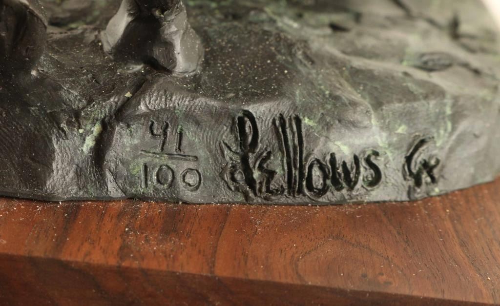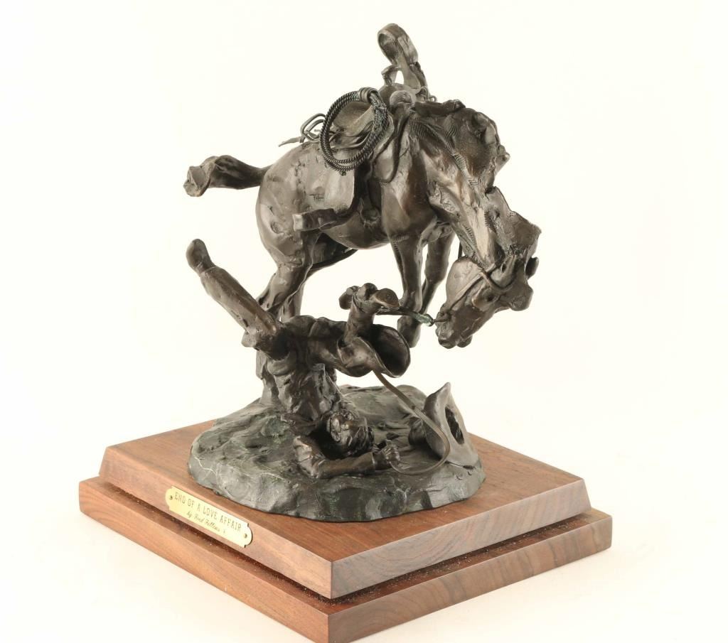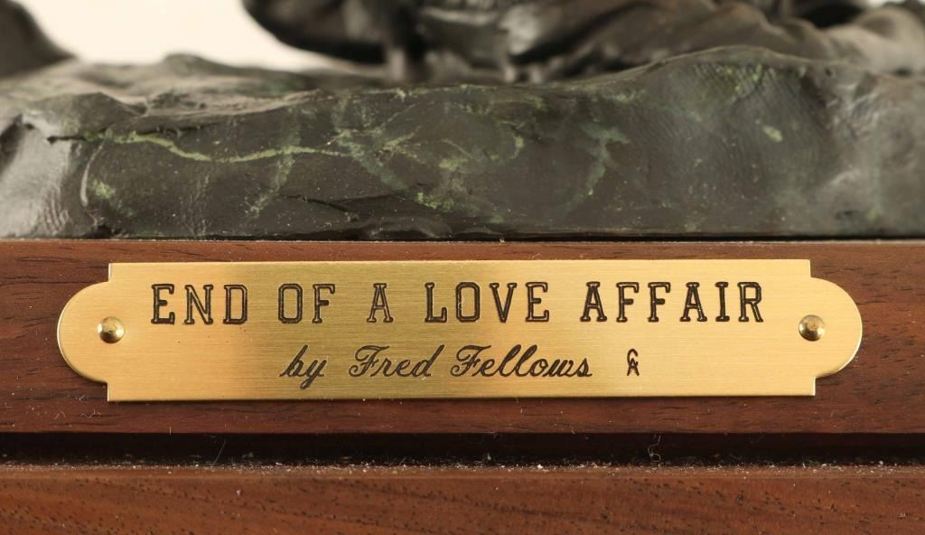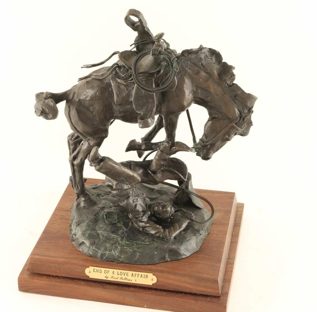 by Fred Fellows entitled "End of a love affair", signed on base, #41/100, 9"X9"x11". BIO- Fred Fellows had early exposure to ranching and Otoe and Osage Indian reservations. As an artist, he is self-taught, and earned membership (and in 1997 presidency) of the Cowboy Artists of America. Fred Fellows grew up in California where he worked as a cowboy and apprenticed for four years to a saddle maker. Later attended Art Center School in Los Angeles and began a successful career in the aircraft industry. In 1964, he moved his family to Big Fork, Montana to devote himself to painting, while also spending his spare time roping for the big Montana cow outfits.