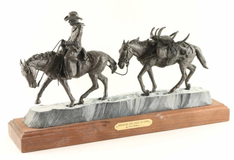 by Fred Fellows entitled "Break the Trail to Camp", #50/100, signed in bronzes measures 4"x19"X10". BIO- Fred Fellows had early exposure to ranching and Otoe and Osage Indian reservations. As an artist, he is self-taught, and earned membership (and in 1997 presidency) of the Cowboy Artists of America. Fred Fellows grew up in California where he worked as a cowboy and apprenticed for four years to a saddle maker. Later attended Art Center School in Los Angeles and began a successful career in the aircraft industry. In 1964, he moved his family to Big Fork, Montana to devote himself to painting, while also spending his spare time roping for the big Montana cow outfits.