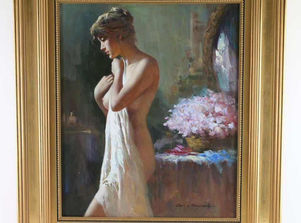 Done By Artist "Ou Chujian" entitled "Pink Flower" signed lower right. Framed in beautiful gold frame, image size measuring 23x19.