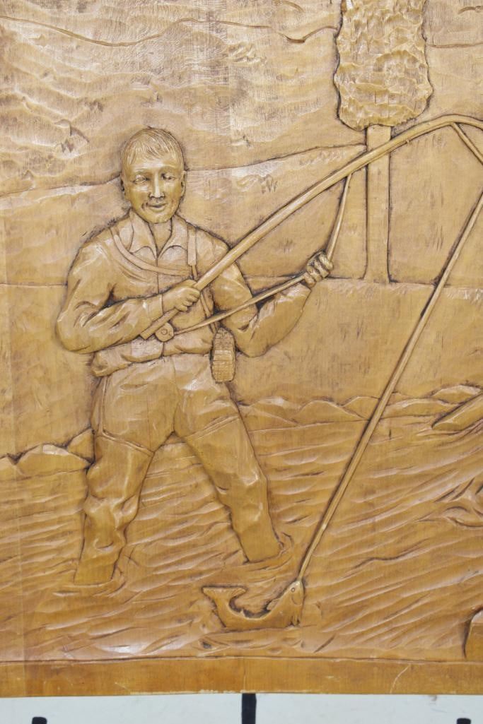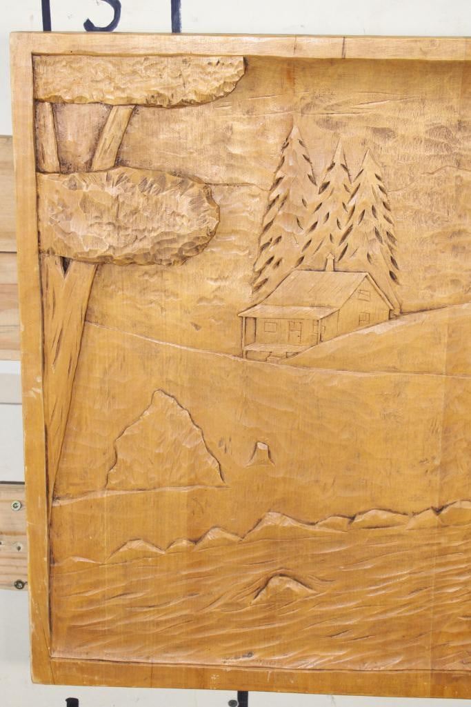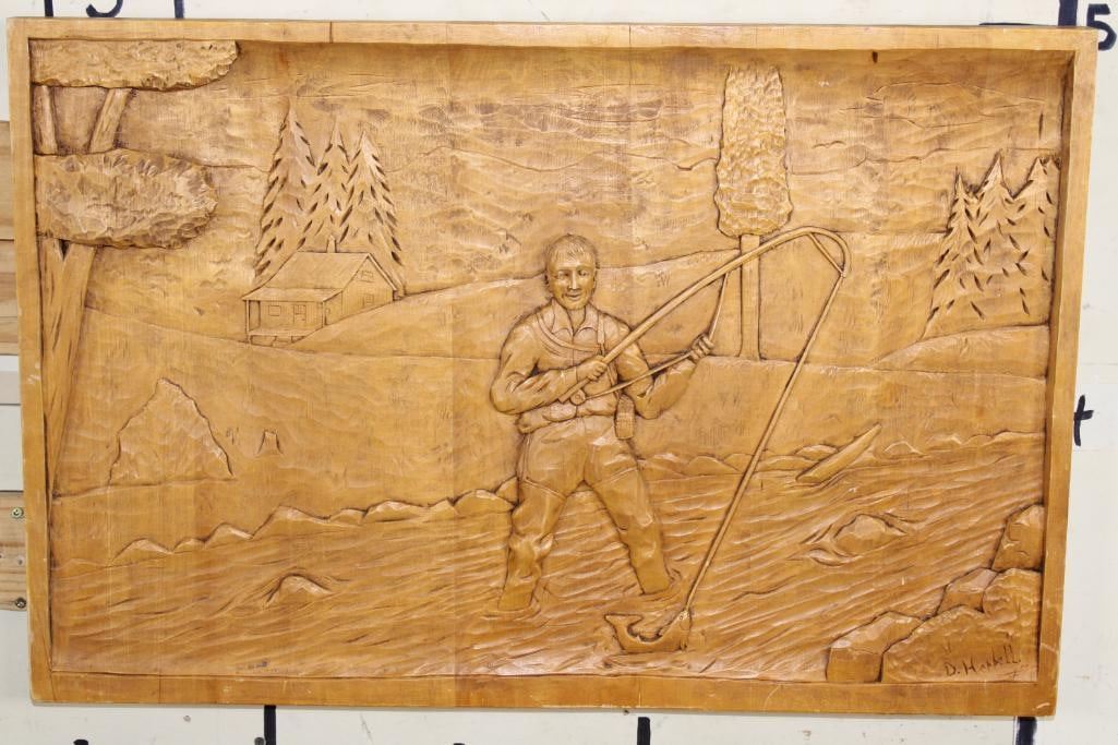 Original Hand-carved Wood Art by Quebec Canada artist D. Heppell. It measures 31" Long x 20.5" Wide x 1 3/8" Thick. COLLECTIBLE WESTERN AMERICANA ART