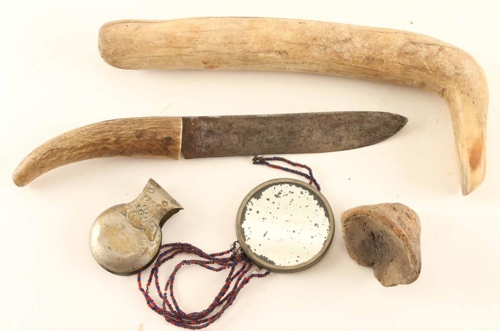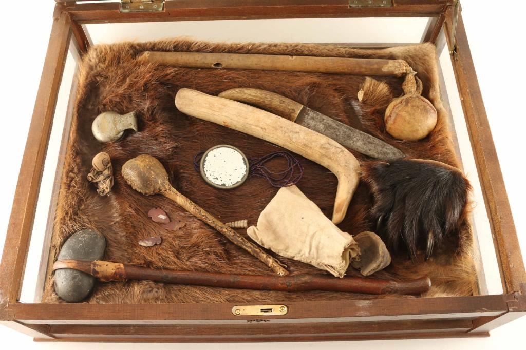 Includes Indian Artifacts circa 1850-1880 in a display case measuring 18" x 6" x 22 1/2". Includes Indian Medicine Bag, Digging tool, Trade knife, bear claw, 2 clubs and more.