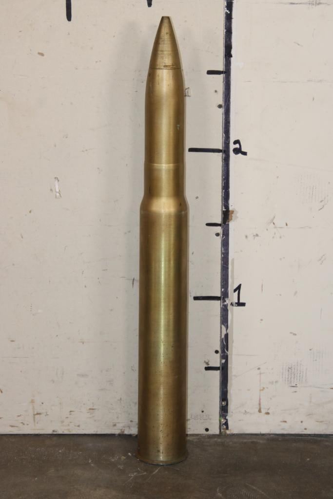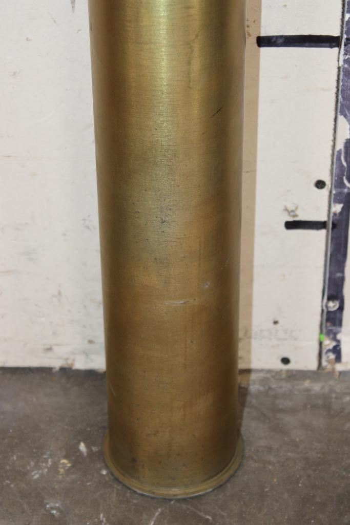 Orignial U.S. Miliary Inert 90mm Artillery Shell made of Brass. It measures 34.75" Tall x 4.25" Base Diameter and the Total Weight is 25 lbs 6 oz. The bottom is labeled "MK8 Mod. 1", "713988-0", and "SHCORP". The 90mm gun was a significant anti-aircraft and anti-tank gun used by the U.S. during WWII into 1946. COLLECTIBLE WW2 MEMORABILIA