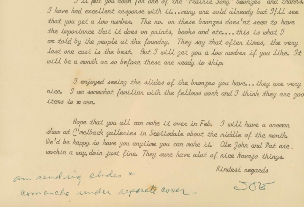 Dated July 27th 1964. Letter to the Anderson's about bronzes he was commissioning. Includes a lithograph of bucking bronco and rider.