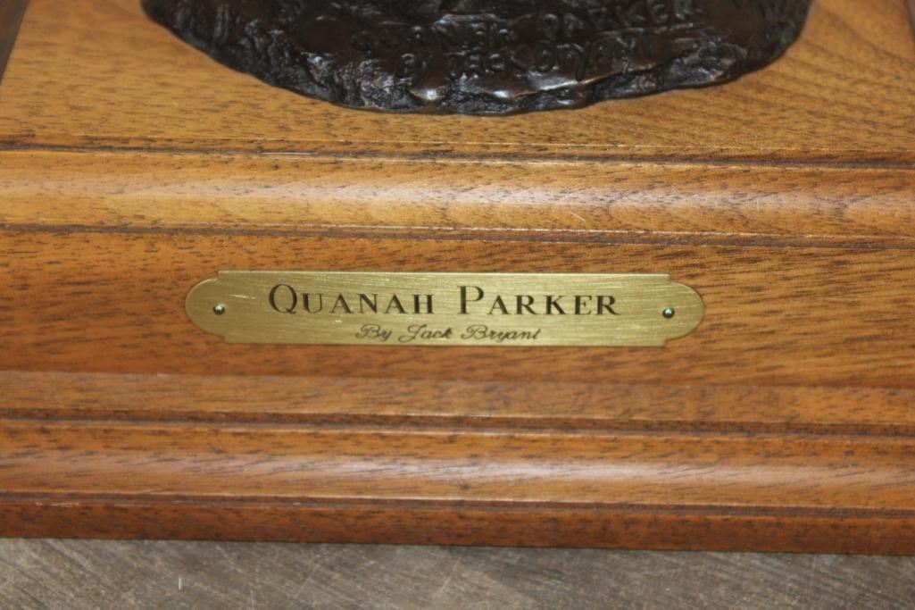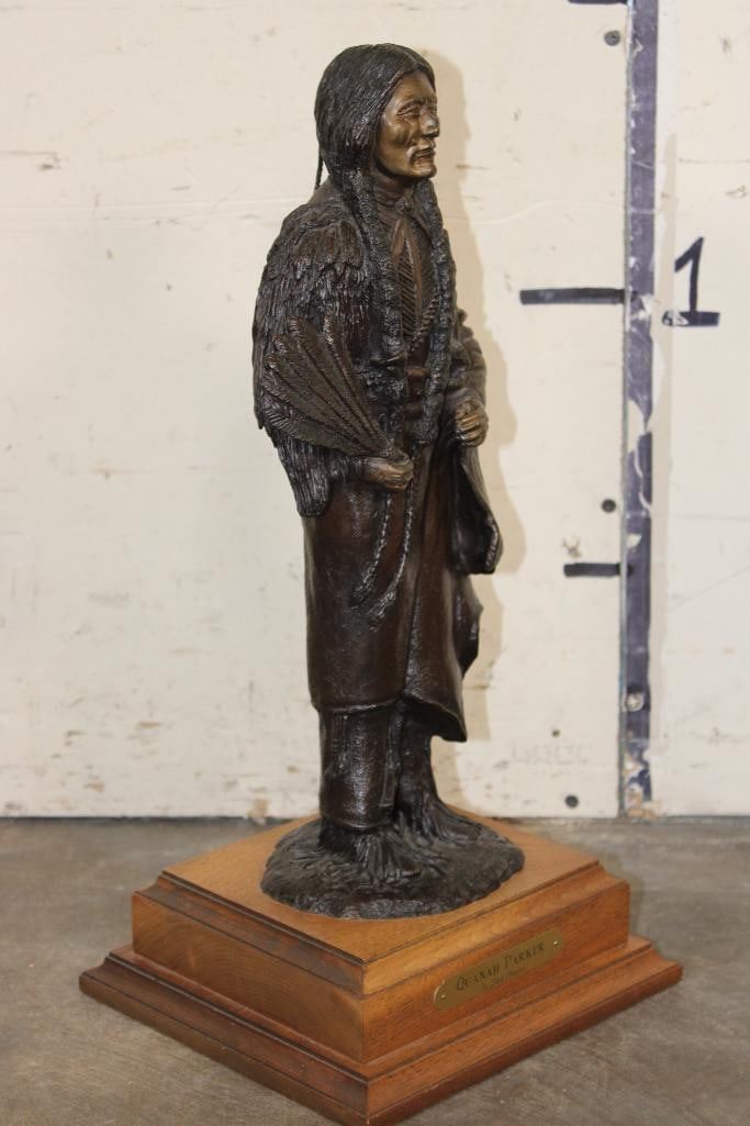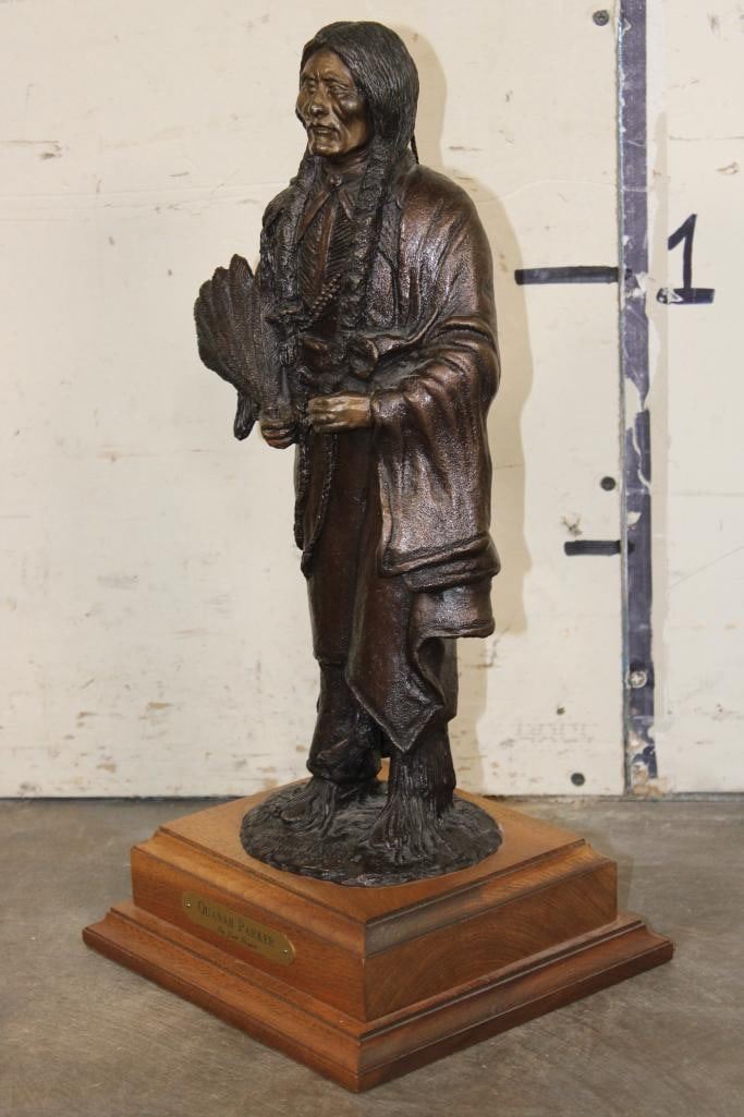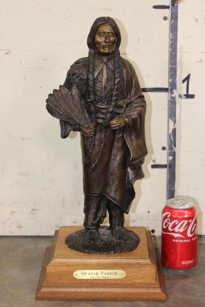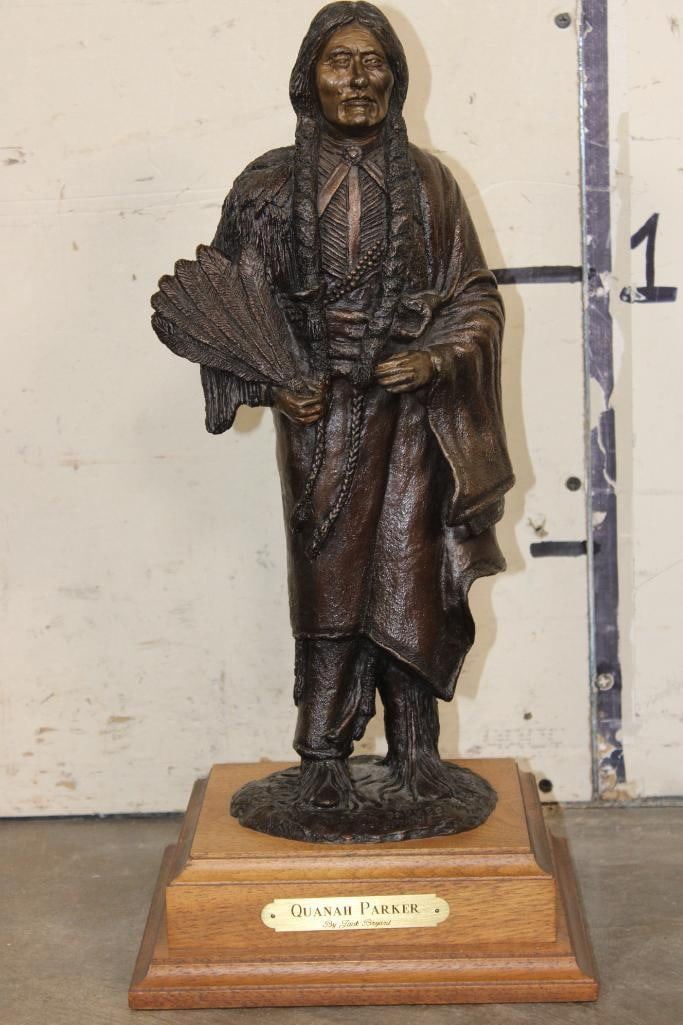 Original Limited Edition Bronze "Quanah Parker" Sculpture. It has been signed by the artist "Jack Bryant #40/200" and has a Walnut Wood Base. The solid Bronze measures 18" Tall x 8.5" Long x 8" Wide. The Total Weight is 16 lbs 15 oz. This is a smaller version of the Jack Bryant Quanah Parker statue in Fort Worth. In the courtyard outside the Texas Cowboy Hall of Fame stands the large statue of Quanah Parker sculpted by Jack Bryant. Quanah was the last chief of the Comanche nation and a frequent visitor to the Fort Worth Stockyards. A memorial was built in his honor, across the street in the Stockyards is the Cowtown Coliseum, where, in 1909, Parker and 38 members of his tribe rode in full regalia as part of what is now the Fort Worth Stock Show and Rodeo. The statue used to be on display inside the Coliseum until it was moved to its current location next to a new Texas Historical Marker. COLLECTIBLE NATIVE AMERICAN BRONZE ART SCULPTURES AND STATUES