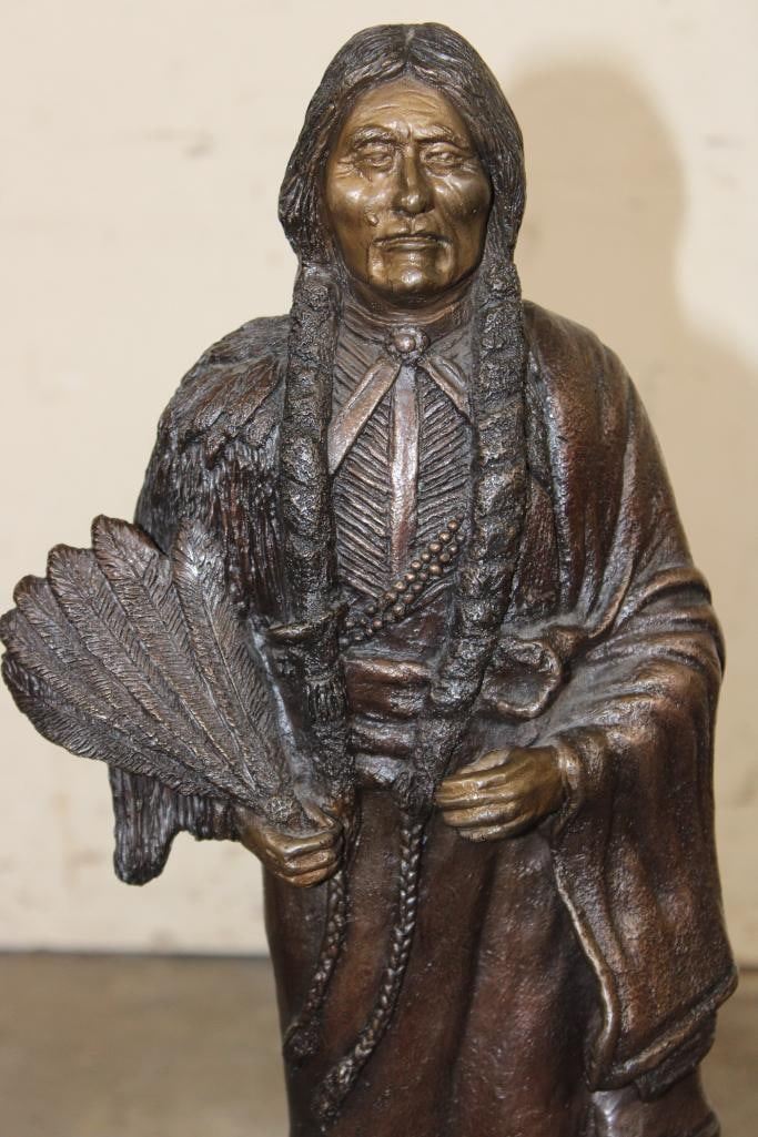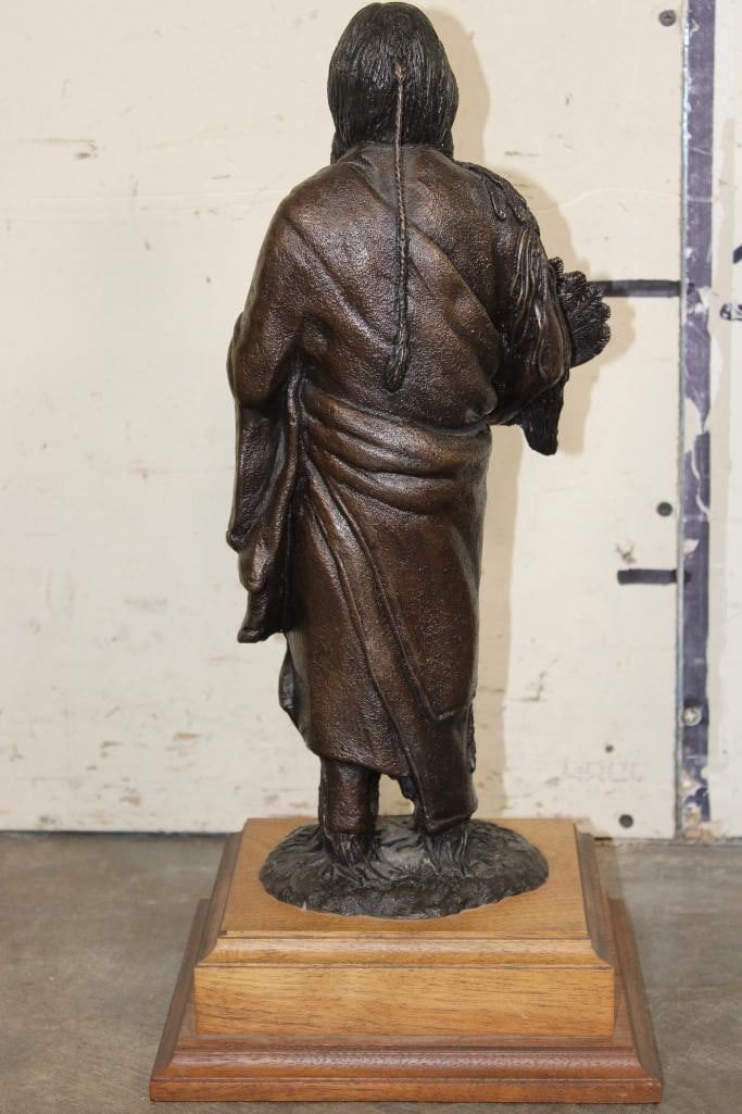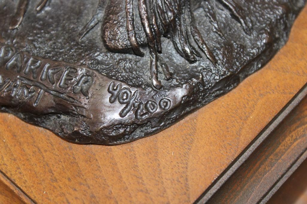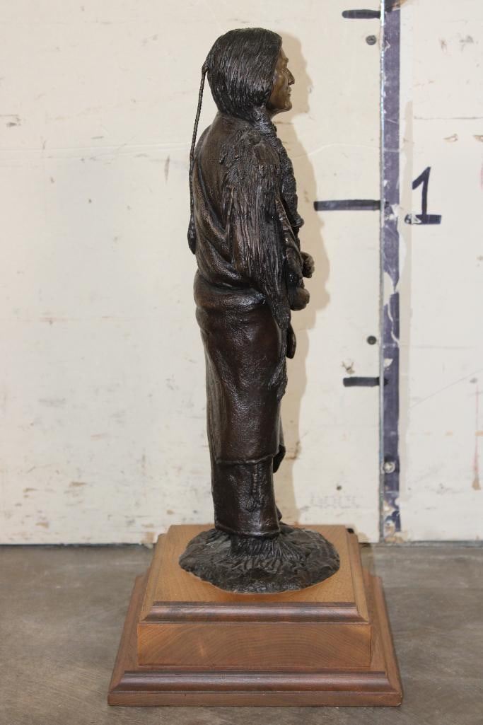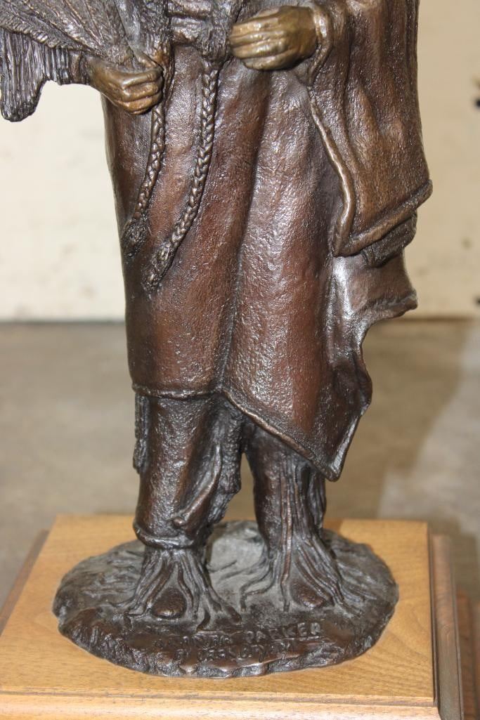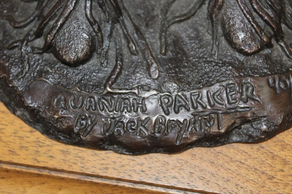 Original Limited Edition Bronze "Quanah Parker" Sculpture. It has been signed by the artist "Jack Bryant #40/200" and has a Walnut Wood Base. The solid Bronze measures 18" Tall x 8.5" Long x 8" Wide. The Total Weight is 16 lbs 15 oz. This is a smaller version of the Jack Bryant Quanah Parker statue in Fort Worth. In the courtyard outside the Texas Cowboy Hall of Fame stands the large statue of Quanah Parker sculpted by Jack Bryant. Quanah was the last chief of the Comanche nation and a frequent visitor to the Fort Worth Stockyards. A memorial was built in his honor, across the street in the Stockyards is the Cowtown Coliseum, where, in 1909, Parker and 38 members of his tribe rode in full regalia as part of what is now the Fort Worth Stock Show and Rodeo. The statue used to be on display inside the Coliseum until it was moved to its current location next to a new Texas Historical Marker. COLLECTIBLE NATIVE AMERICAN BRONZE ART SCULPTURES AND STATUES