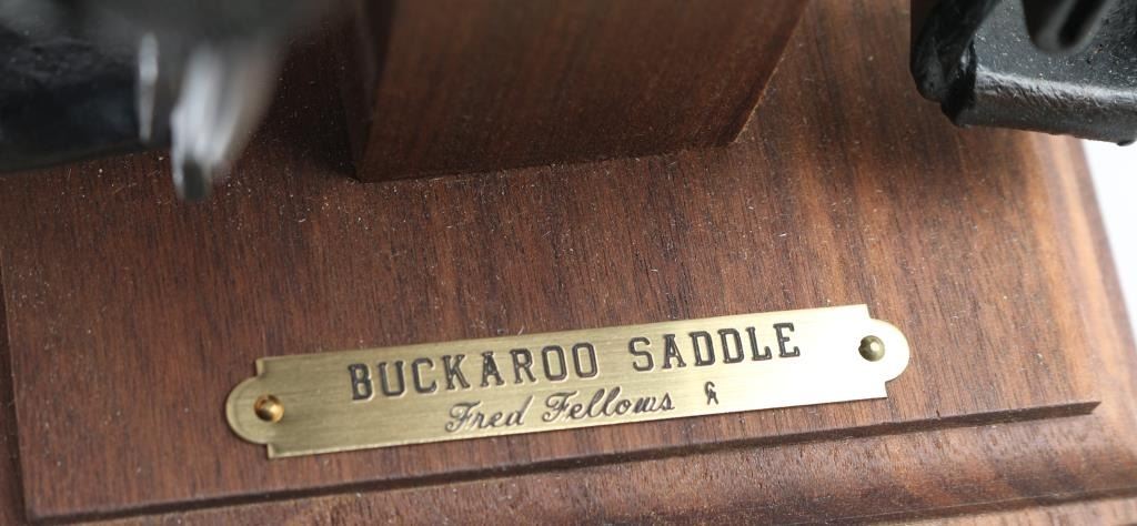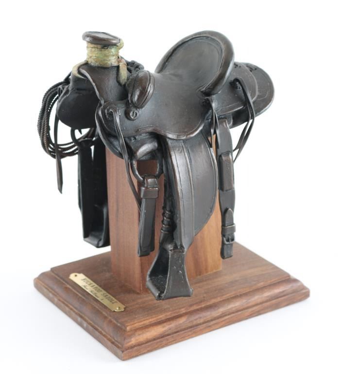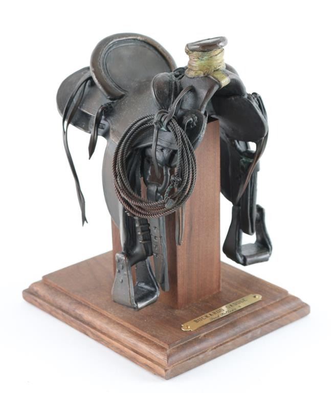 By famous cowboy artist, "Fred Fellows" this wonderful piece is mounted on a hard wood stand, with plaque on the front reading the title of the bronze. It is numbered under the pommel, "10/100" it is in beautiful condition and its signed under the "Cantle" with cattle brand. This bronze measures 5"x6"x8" "Highly Collectable"