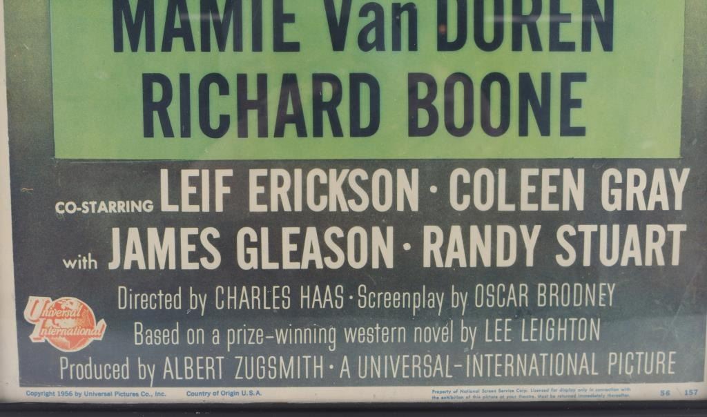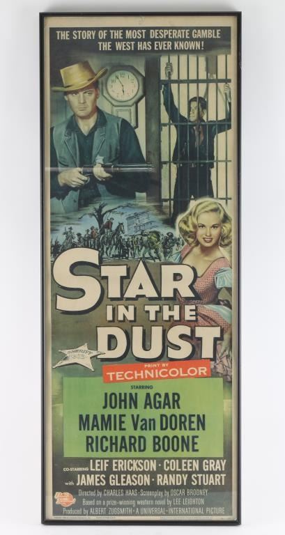 "Star In The Dust" featuring John Agar, Mamie Van Doren, and Richard Boone. Approx 36" by 157". Property of the National Screen Service, Dated 1956. Fading and folding. Great artwork.