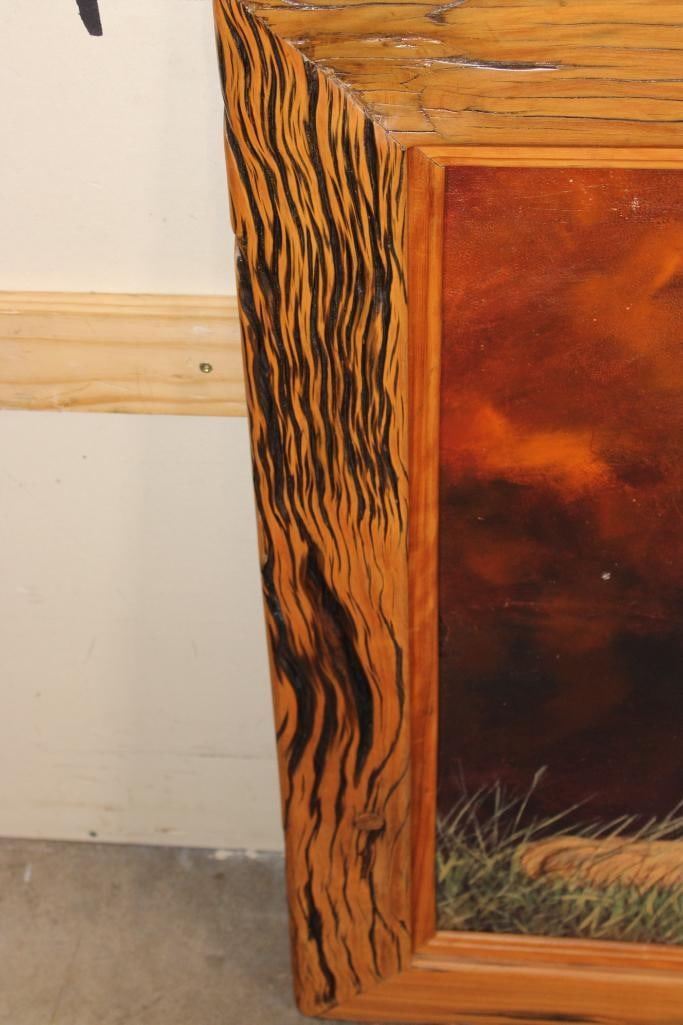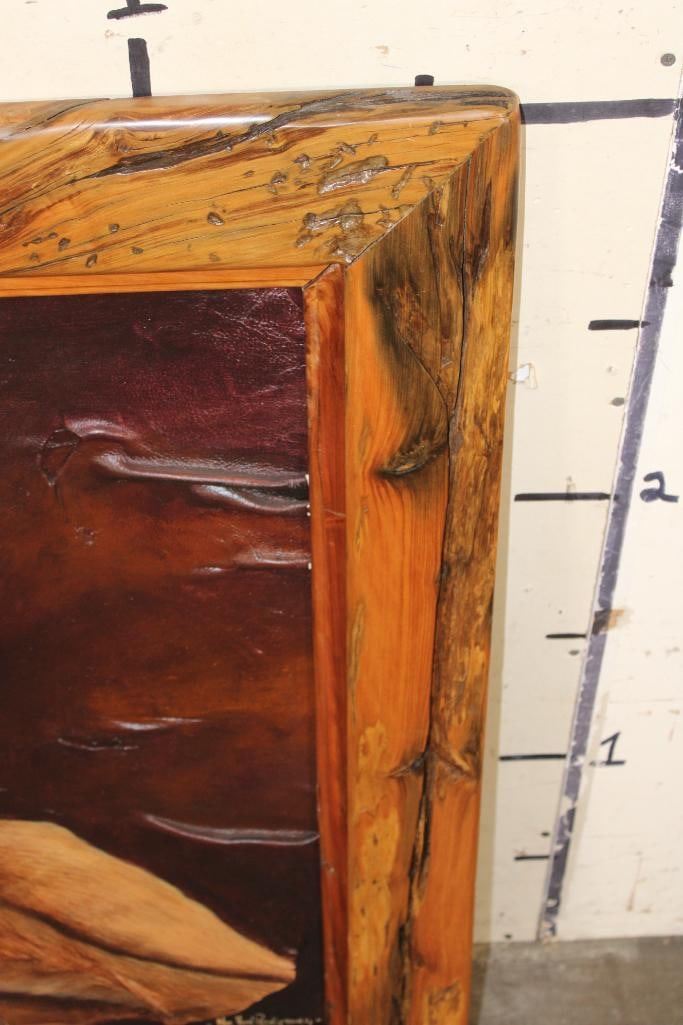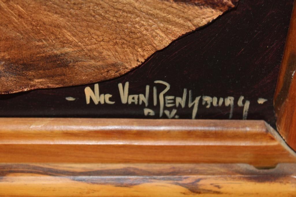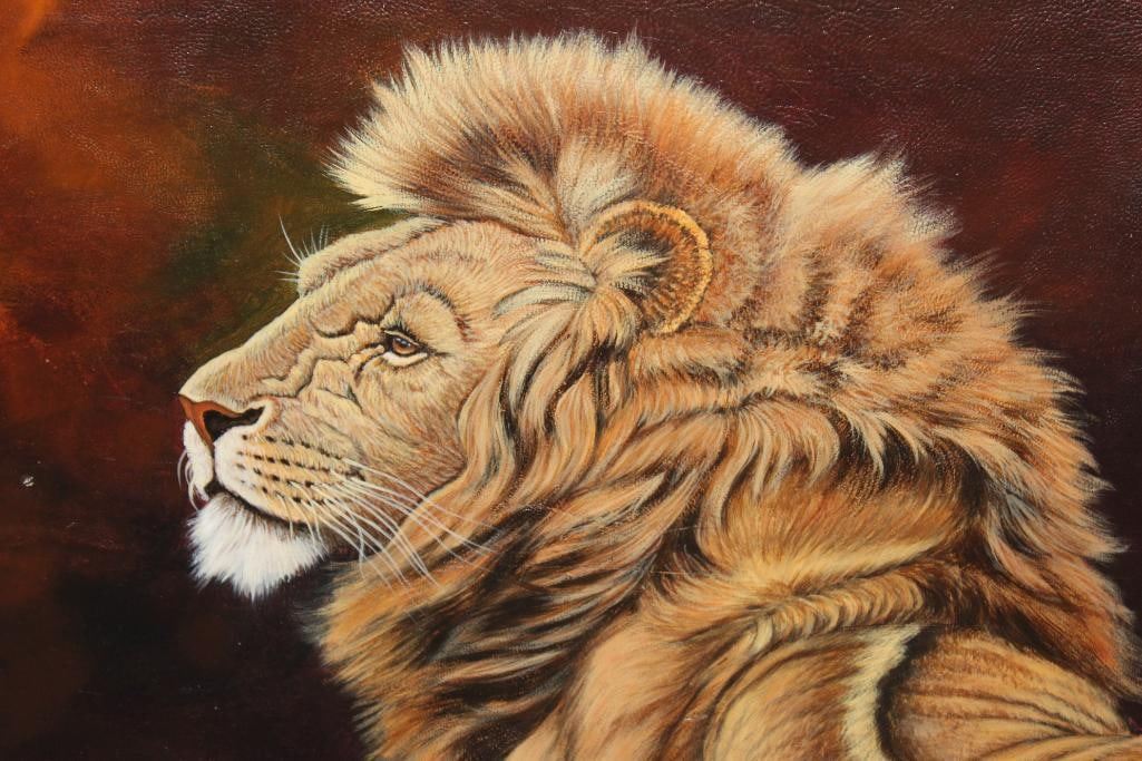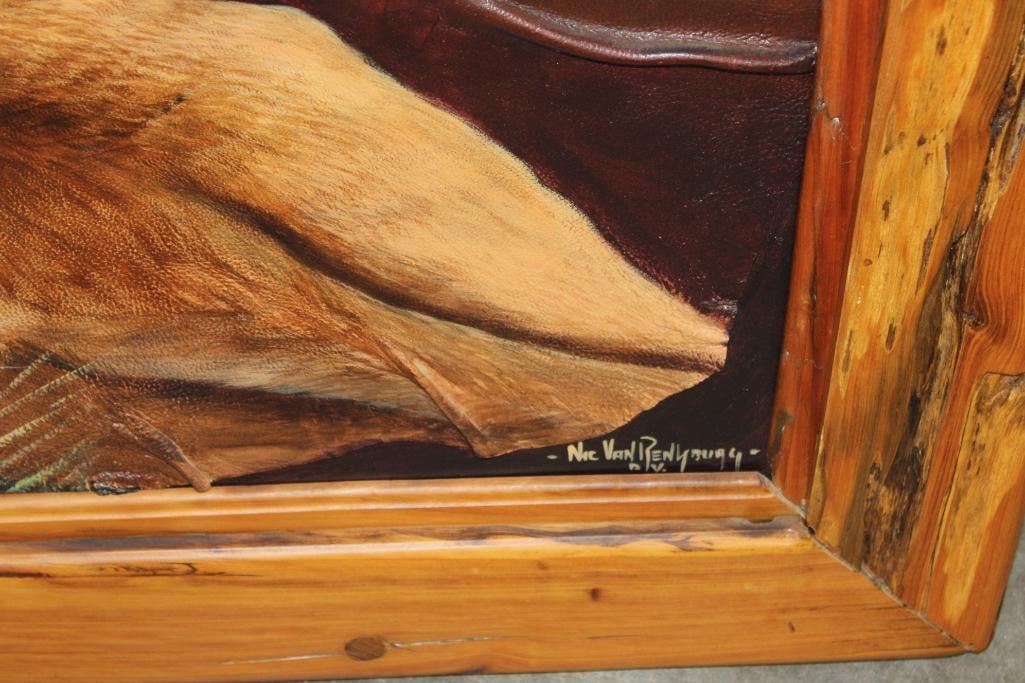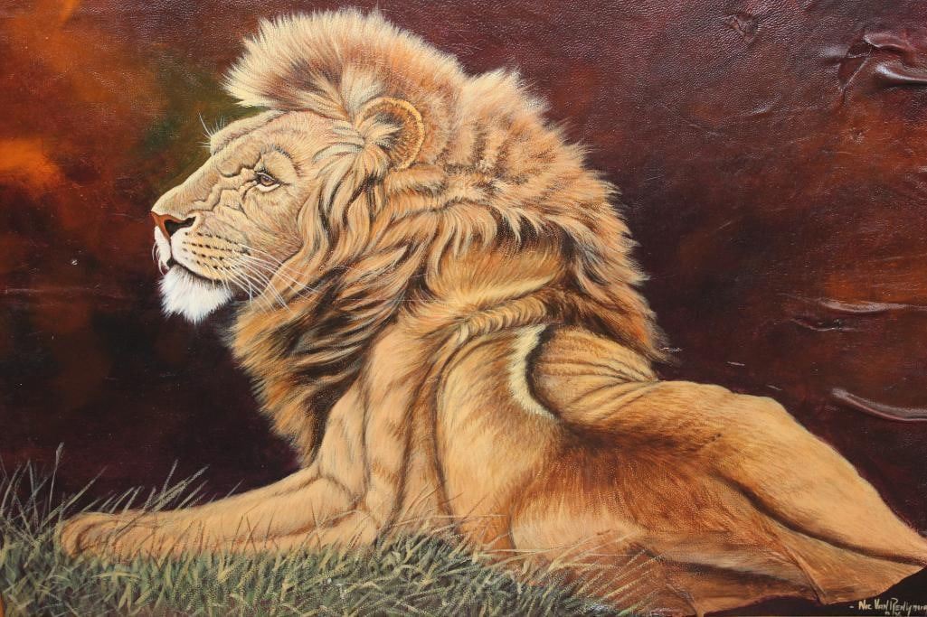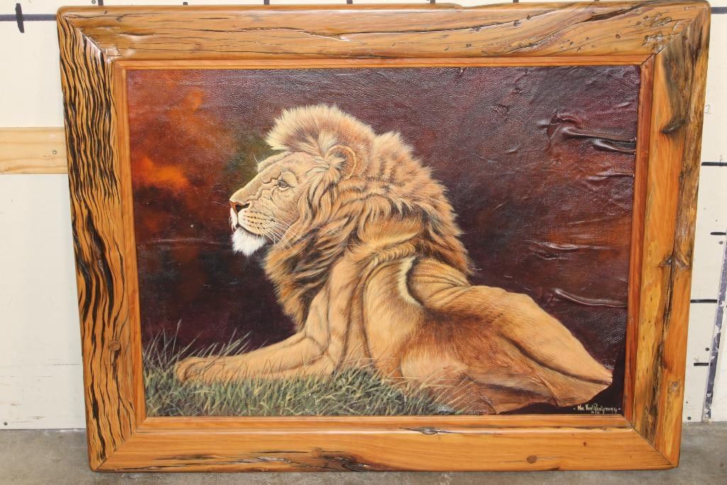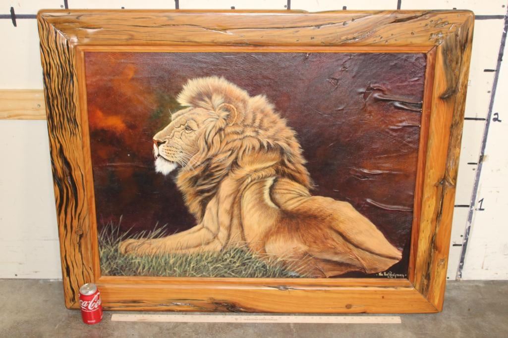 *One of a Kind* Original Framed Oil Painting signed by South African artist "Nic Van Rensburg". This piece depicts a regal Lion that has been painted on Leather. It is displayed in?an African Railwood Frame that measures 47" Wide x 38" Tall.?This is a one-of-a-kind painting, the artist will not copy the painting as every piece is unique. Proudly produced in South Africa. COLLECTIBLE FRAMED AFRICAN ART?*This item was sold in our last auction. The buyer did not pay, it is being resold*.