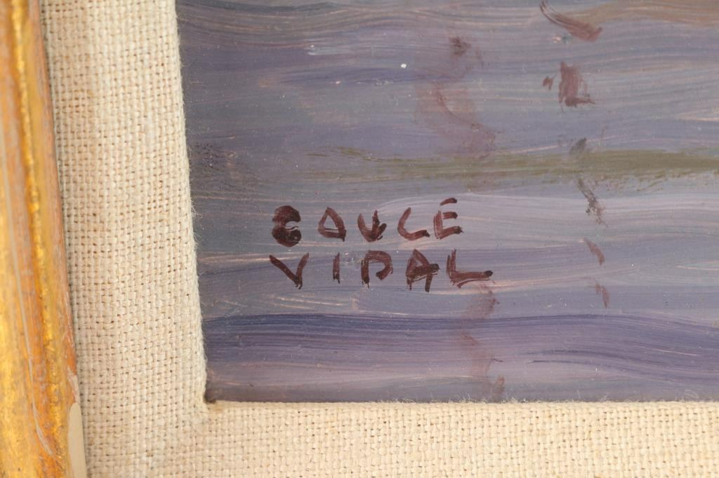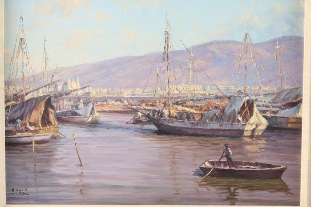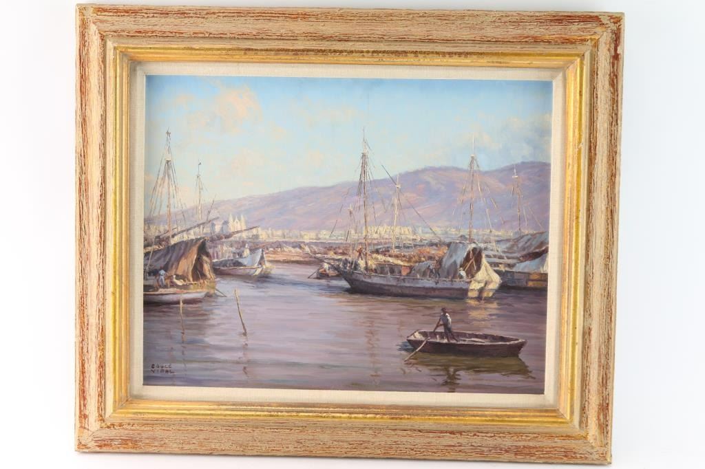 Titled "Port Au Prince, Haiti", signed lower left corner. Couce Vidal was active and lived in Massachussets. Measures 17 1/2" x 13 1/2", in distressed gold and russet wood frame measures 24" x 20". Recently de-accessioned from The Phippen Museum permanent collection.