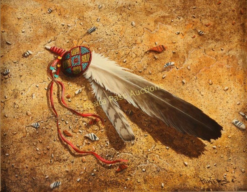 Entitled "Back to the Earth" signed lower right. Image measures 17 1/4"x13 1/2"" in rustic frame handmade by the artist with gold painted insets. Long years on the Navajo reservation as a working cowboy/bull rider infuses power and authenticity into the surrealist style of Kim Power’s western art. Entirely self taught, Kim’s creation and continuing development of a truly unique treatment of a largely traditional subject began in 1984 when he was asked to create a 20’ x 30’ mural portraying work in the gold fields of the Yreka, CA historic district. His work is also displayed in the Maritime Museum in Baltimore and the Ronald Reagan ranch in California. Kim deeply feels and his work powerfully reflects the joys and plights of the Indians as civilization encroaches on land and traditions. Kim’s work is available as originals, limited edition prints, Giclee, and note cards. Commissions, and personalization are also available. Using his knowledge and know-how from being a finish carpenter, Kim cuts, stains, and assembles each custom built frame. From the rope and tacking to the leather around the corners. Some of the frames can have upwards of 100 hand pounded tacks.