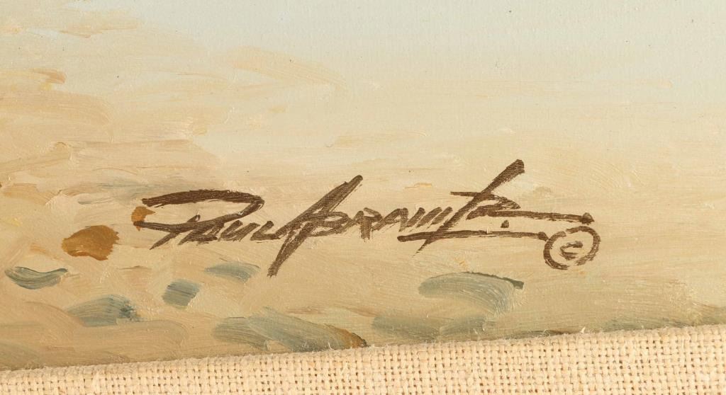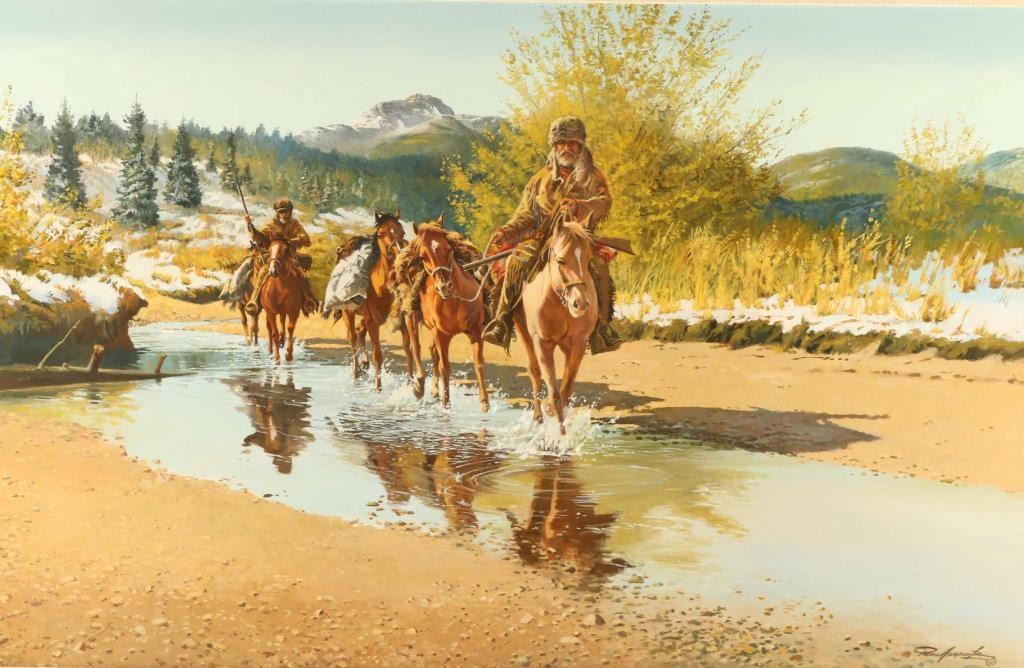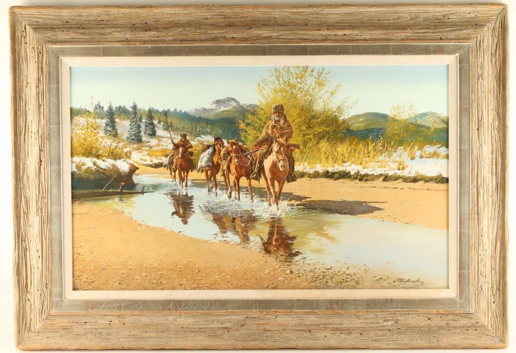 by noted artist Paul Abram Jr., Depicting mountain men crossing a water way. Measures 29 1/4" x 17 1/4". In barn wood frame. BIO- Paul Abram, Jr. was a realist sculptor and painter of the historic American West. His work includes mixed media, watercolor, oil paintings, and bronze sculpture. He carefully created his images through the use of sketches and photography. In 1981, he received gold awards for mixed media at the George Phippen Memorial Day Show, and for best show and best watercolor in the American Indian and Cowboy Artist show.
