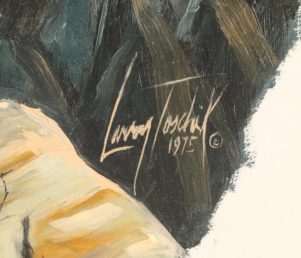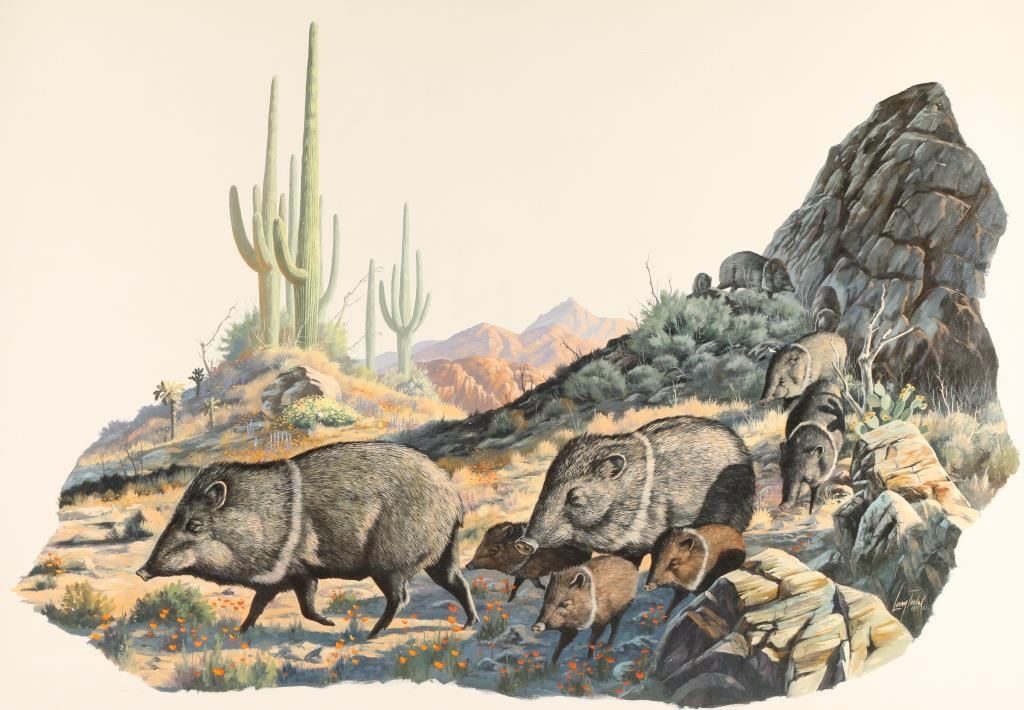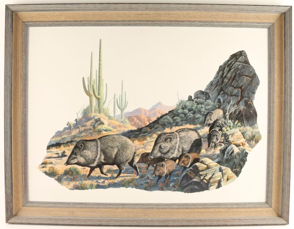 by noted Wisconsin wildlife artist Larry Toschik, dated 1975, entitled Spring Parade, depicting Javelina. Hand signed lower right hand corner. Image size 30X22" Larry Toschik is active/lives in Arizona, Wisconsin. Larry Toschik is known for wildlife, landscape painting, illustration.
