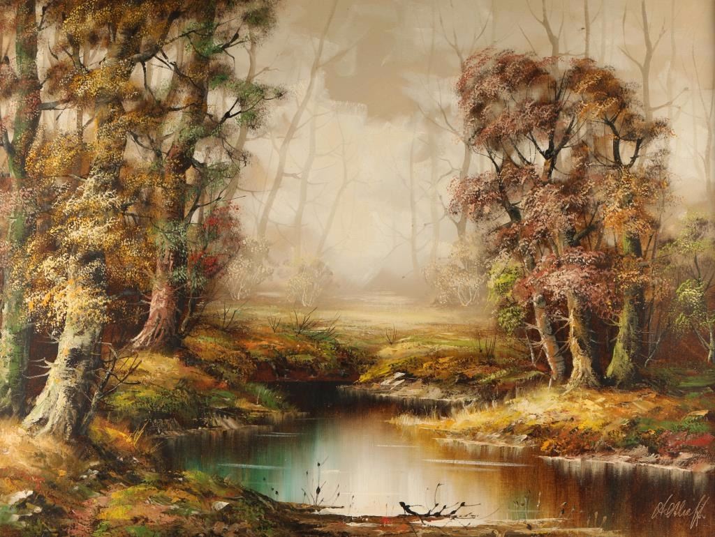 by Ebenernard Alhoff depicting a wooded landscape. Signed lower right Mr. Alhoff was born shortly after the first World War in Austria and studied at the Vienna Academy under professor Kenner and traveled extensively throughout Europe. Most known for his keen interest of his native countryside. Very well known in Austria among European art collectors.