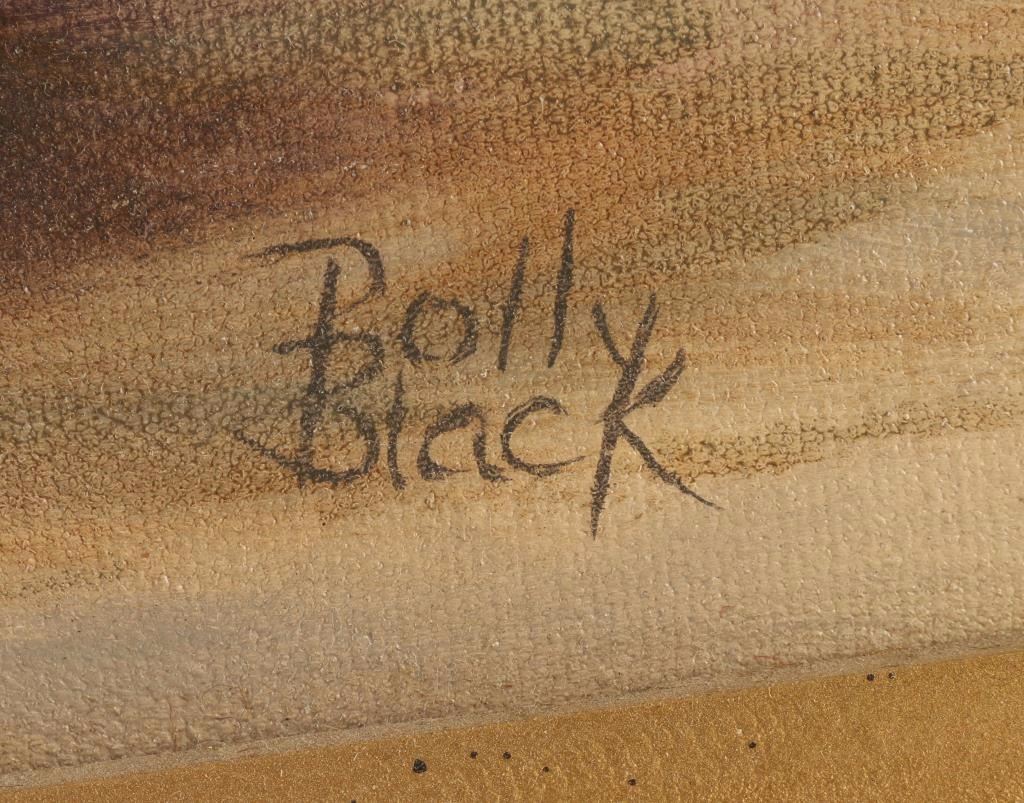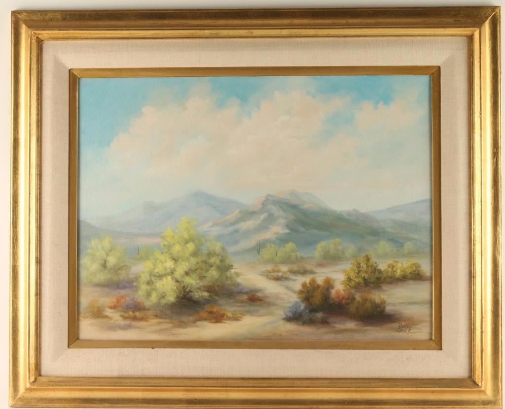 Plein air painting of Arizona desert scene. Signed Polly Black lower right. Image measures 23 1/4" x 17 1/2" in gold painted wood frame with linen inset and gold fillet.