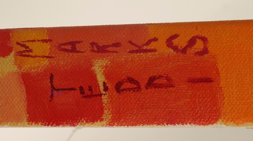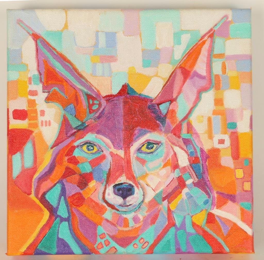 "The Sweet Ninja" by Teddi Marks, a local AZ artist depicting a multi colored coyote. Image measures 8"x8" on a canvas with 1 1/2" wide sides that are painted to match image. Signature on left side. Very playful and innovative use of color.