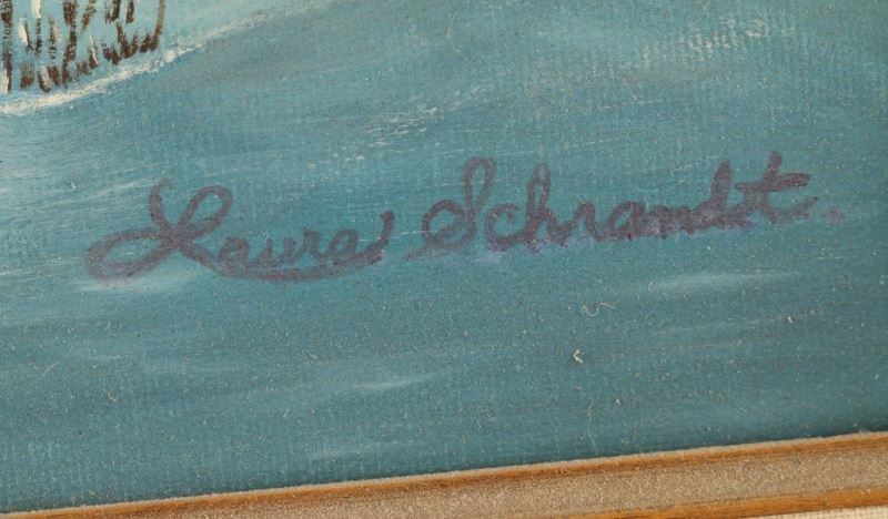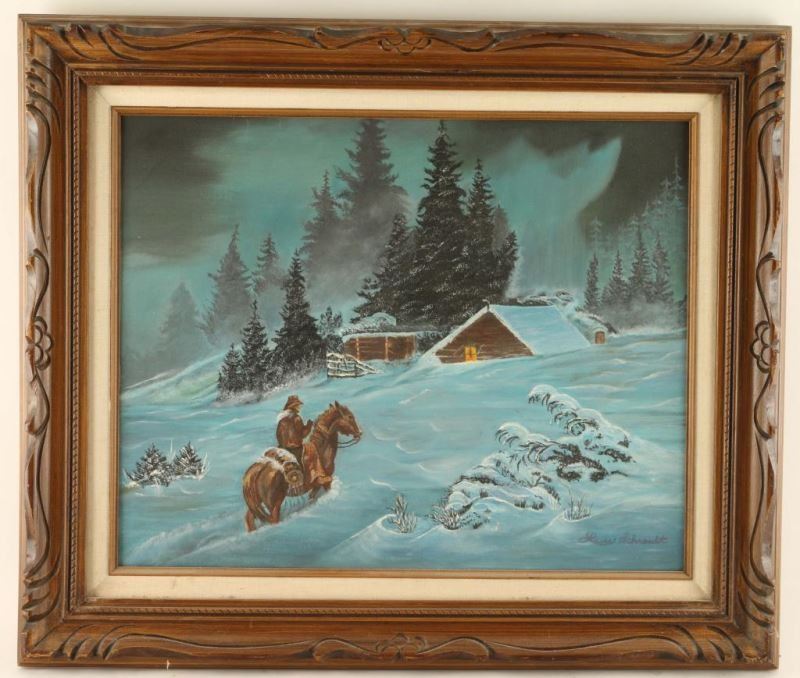 by Laura Schrandt depicting a cowboy in the snow. Signed in wood frame image size 19"x16"