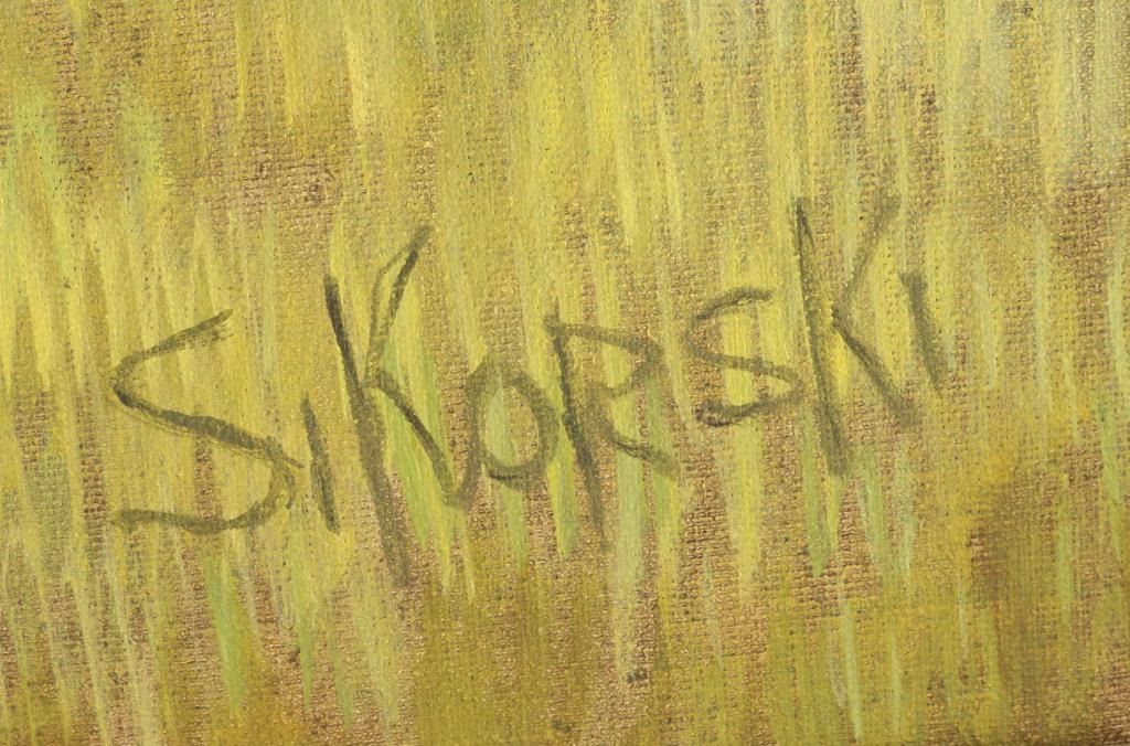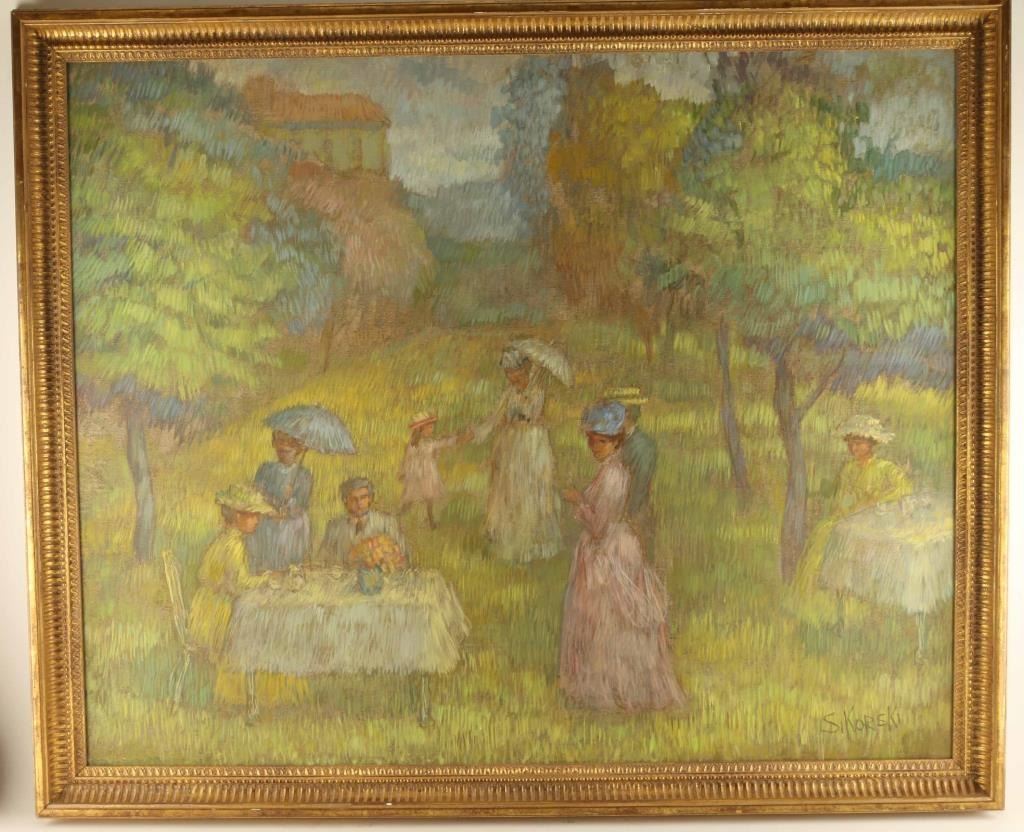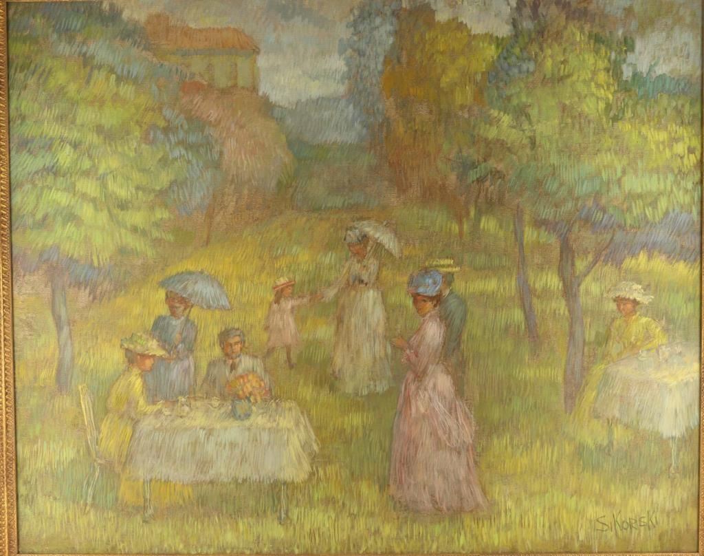Image size 42" x 34". By noted Artist Eva Sikorski. Painted in the style of Monet. Depicts a 'picnic in the park' type scene. Framed with biography.