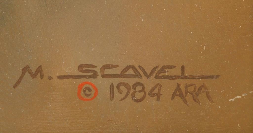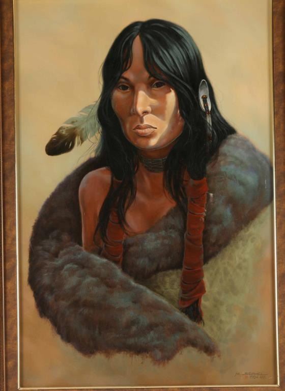by M. Scovel, hand signed in the lower right hand corner depicting an Indian portrait. Made in 1984 in wood frame and image size measures 35 1/2" x 22 1/2". Small bend in canvas on right side above Indian.