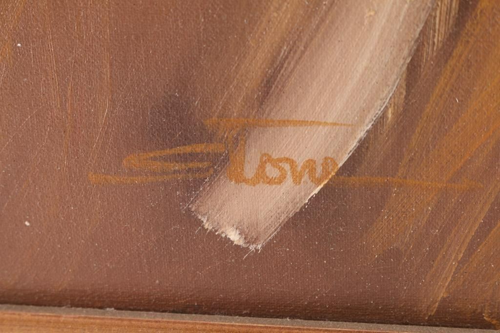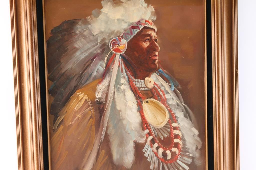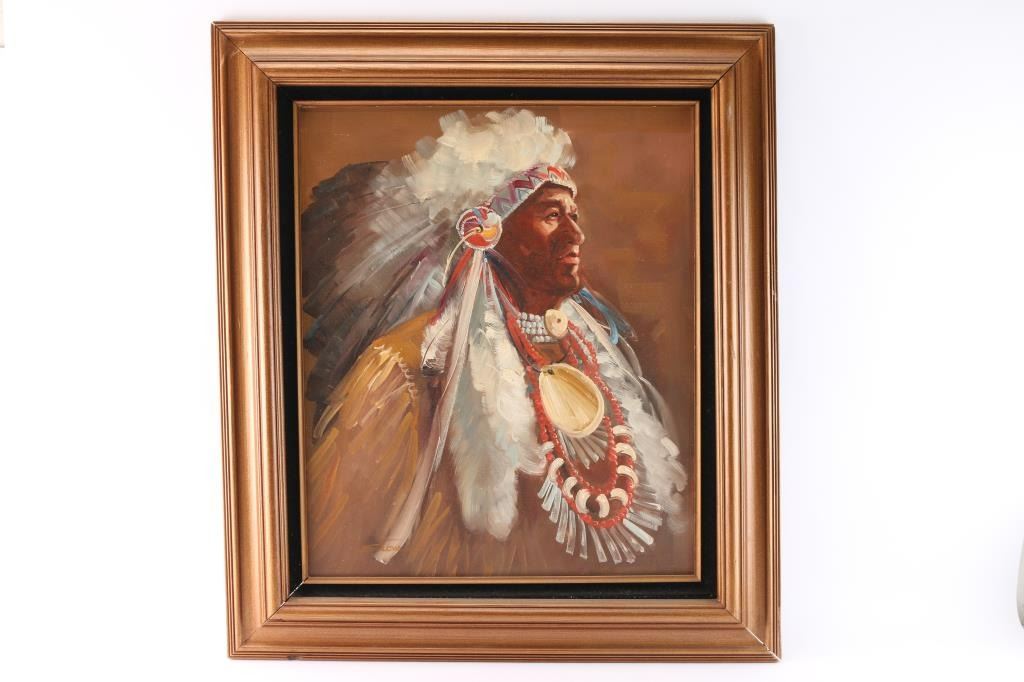 Depicts an "Indian Chief" with headdress and bright coral and bear claw necklace. Signed "Stone".