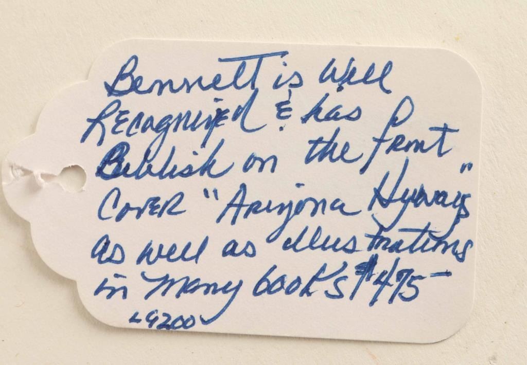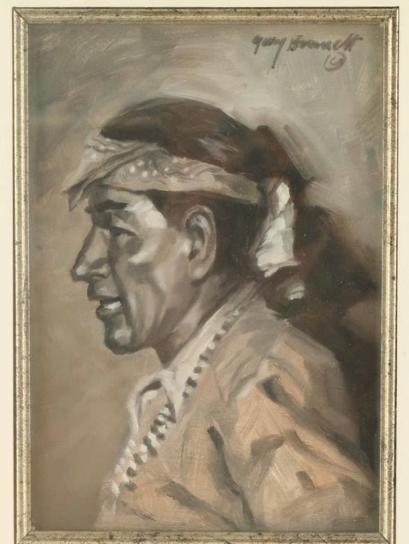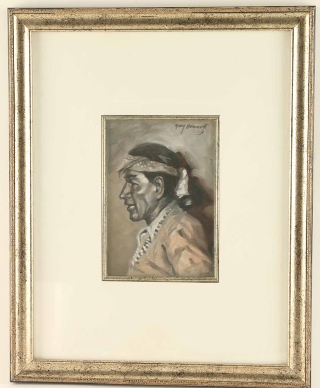 by Gary Bennett, this piece depicts a side profile of a Native American Man. The work is double framed and matted with an image size of 6 3/4" by 4 1/2". Gary Bennet is a noted Arizona artist who has been featured on the cover of "Arizona Highways".