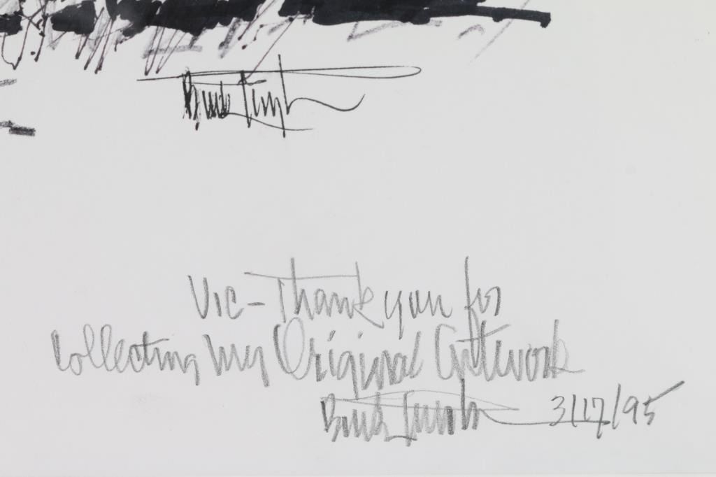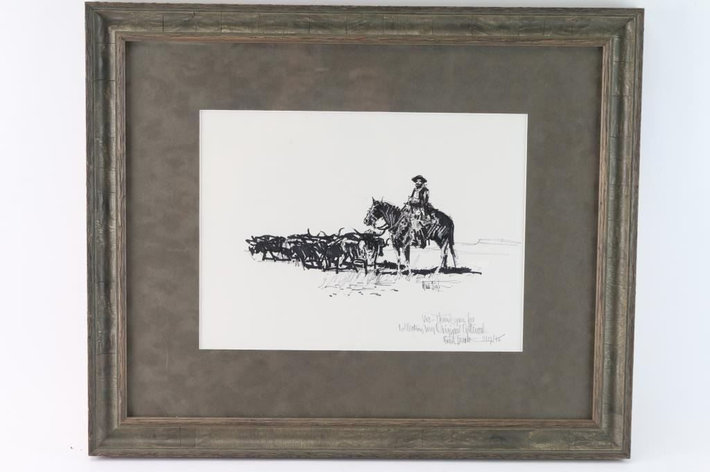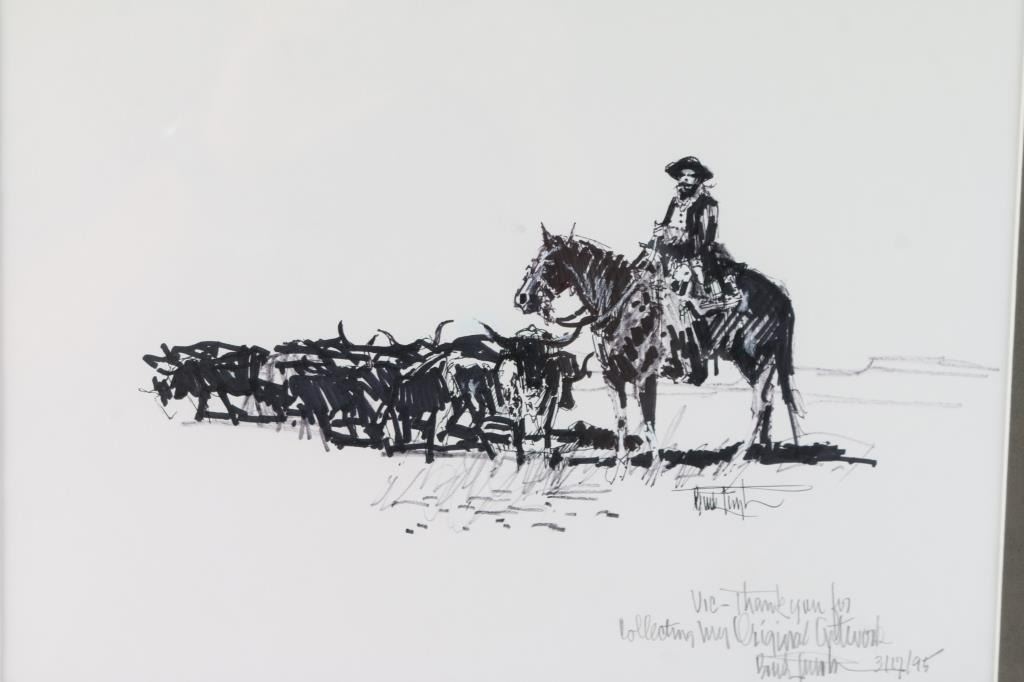 By Buck Taylor, signed lower right with an inscription, "Vic - Thank you for collecting my original artwork. Buck Taylor 3/17/95. Matted in grey suede and framed, measures 22 1/2" x 18 1/2". Drawing measures 13 1/2" x 10".