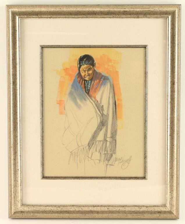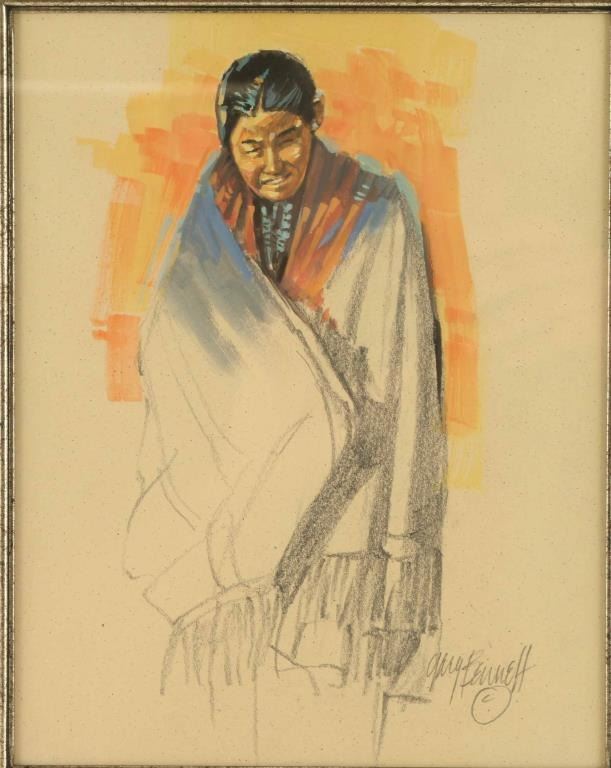 by Arizona artist Gary Bennett entitled "Navajo Girl". The piece showcases a woman with a wonderful pencil that blends into the vibrant Gouache work. Double framed and matted, image size is 7 1/2" by 9 3/4". Gary Bennett's work has been featured on the cover of "Arizona Highways".