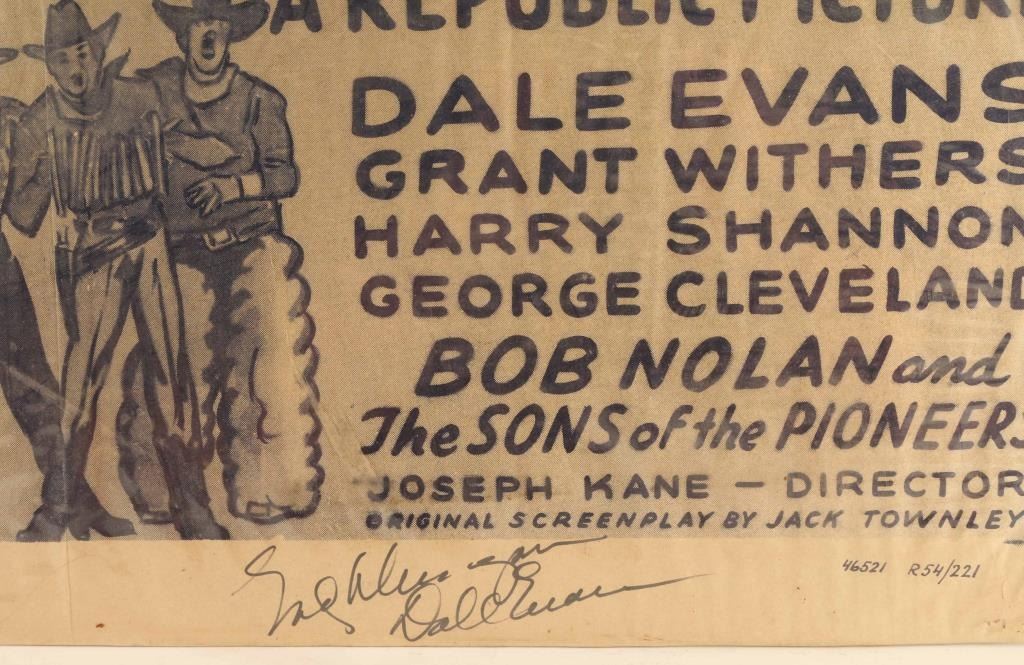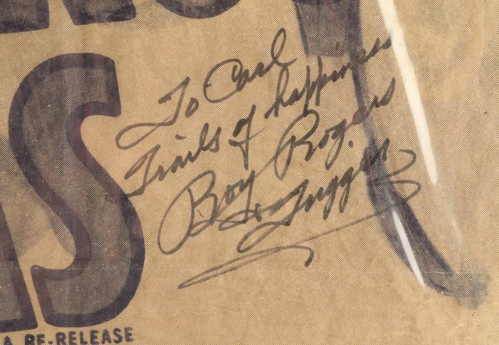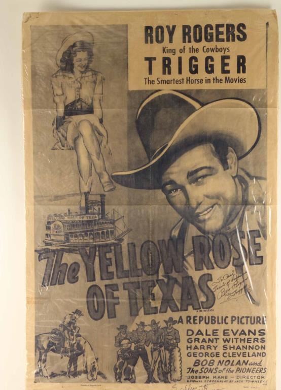 Vintage movie poster for "The Yellow Rose of Texas" starring Roy Rogers and Trigger the Horse. Signature in the middle reads "To Carl, Trails of happiness - Roy Rogers + Trigger". Also includes a signature at the bottom reading "Dale Evans" and other other signature that is difficult to read. Measures 23" x 41".