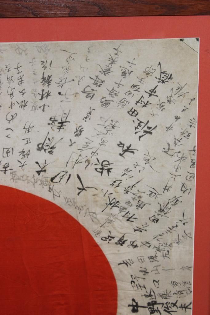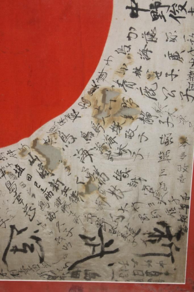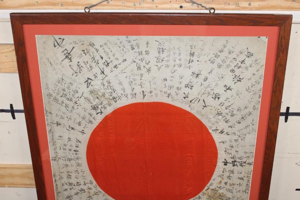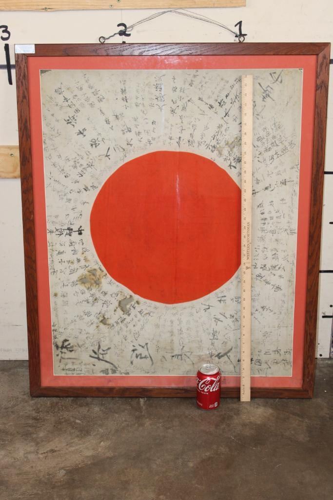 Original WW2 Japanese Silk Yosegaki Hinomaru "Good Luck Flag" from the 1940s. This Glass and Wood Frame is double sided and measures 39" Tall x 32" Wide. You could hang this from the ceiling for a view of both sides. A "yosegaki Himomaru' translates as a "Good Luck Flag" or "Inscribed Hinomaru", is a traditional Silk Japanese flag given to servicemen before deployment. It was given particularly during the military campaigns of the Empire of Japan during World War II. This national flag was a traditional gift signed with short messages from friends, families, and loved ones wishing the soldier victory, safety, and good luck. This Hinomaru is special because the dialect written is so old, it is not used in current day Japan. There are numerous books describing Hinomaru as souvenirs taken home by U.S. Marines and members of the U.S. Army Infantry. COLLECTIBLE WORLD WAR 2 MEMORABILIA