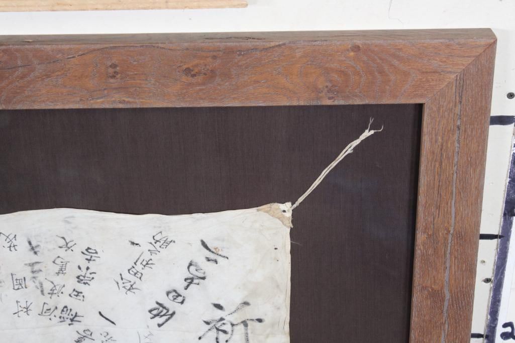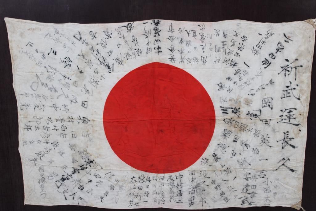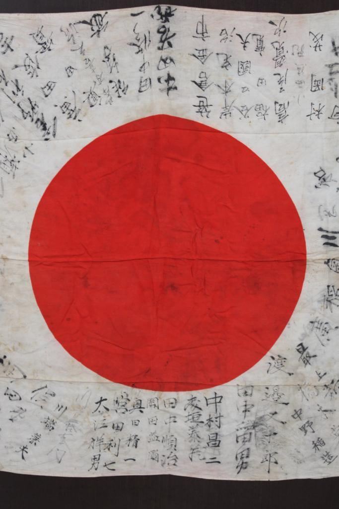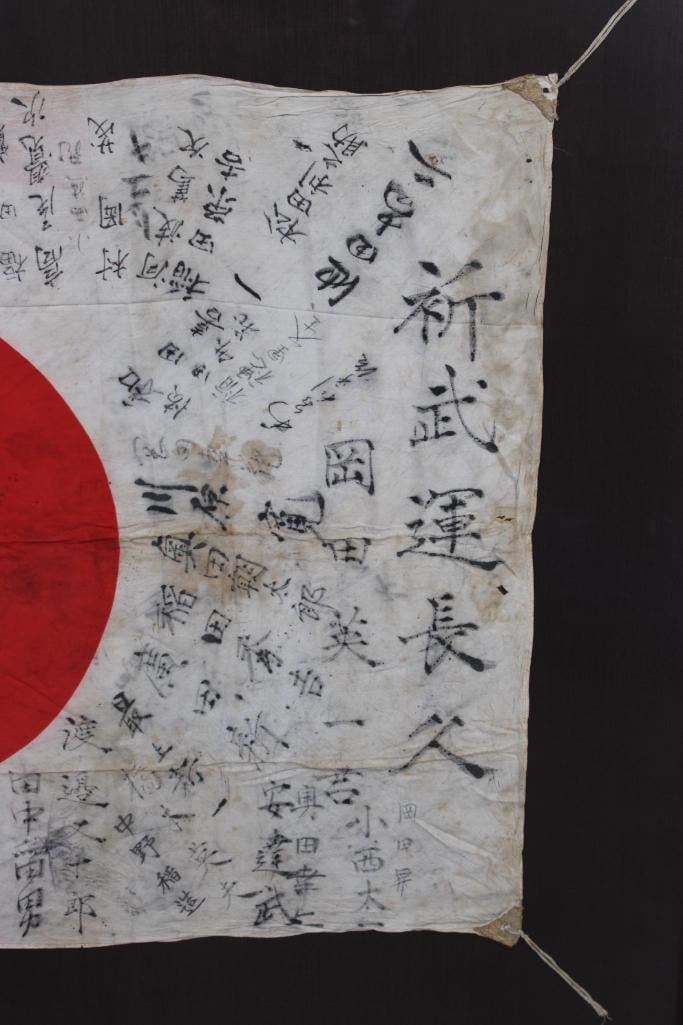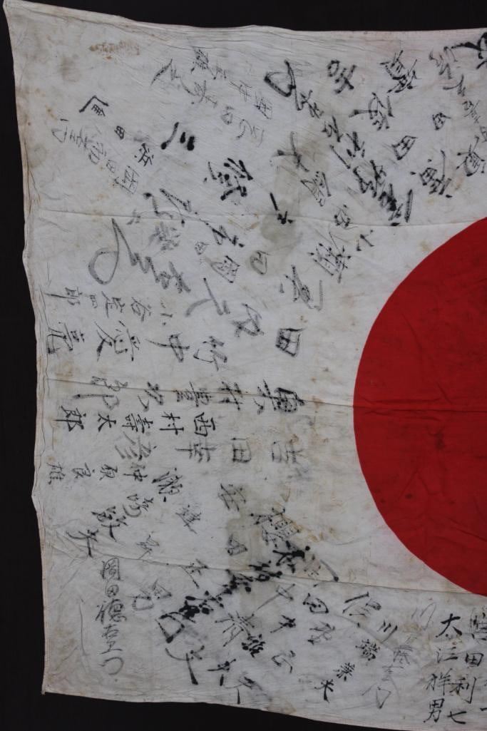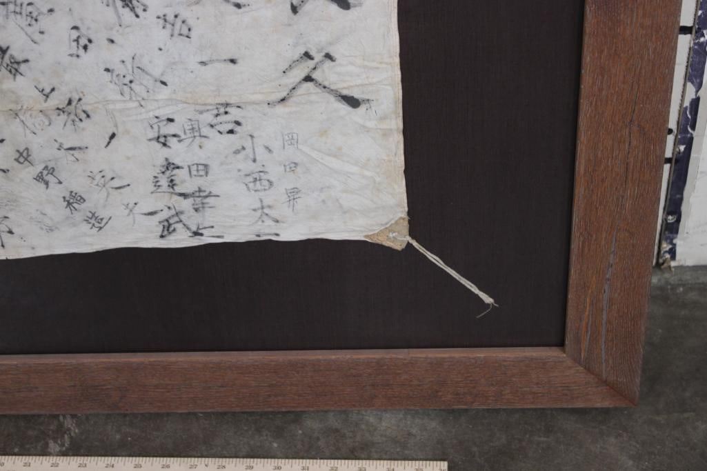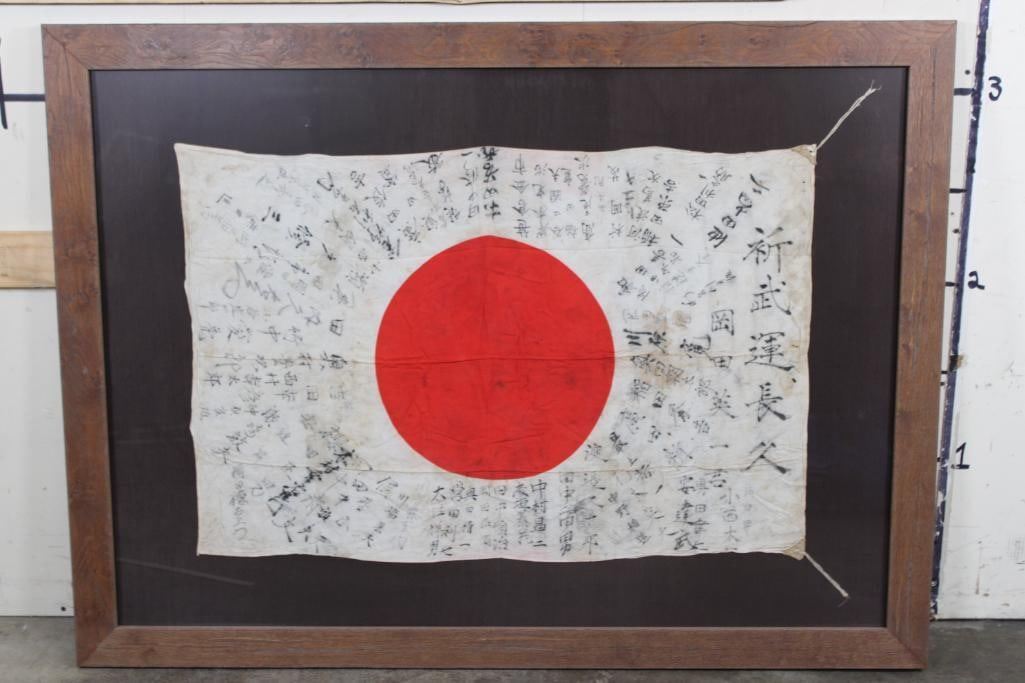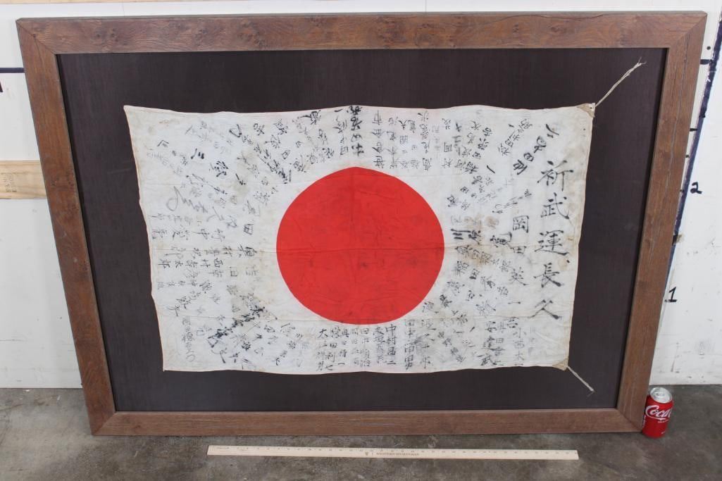 Original WW2 Japanese Silk Yosegaki Hinomaru "Good Luck Flag" from the 1940s in a Glass and Wood Frame that measures 55" Long x 41" Wide. A "yosegaki Himomaru' translates as a "Good Luck Flag" or "Inscribed Hinomaru", is a traditional Silk Japanese flag given to servicemen before deployment. It was given particularly during the military campaigns of the Empire of Japan during World War II. This national flag was a traditional gift signed with short messages from friends, families, and loved ones wishing the soldier victory, safety, and good luck. This Hinomaru is special because the dialect written is so old, it is not used in current day Japan. There are numerous books describing Hinomaru as souvenirs taken home by U.S. Marines and members of the U.S. Army Infantry. COLLECTIBLE WORLD WAR 2 MEMORABILIA