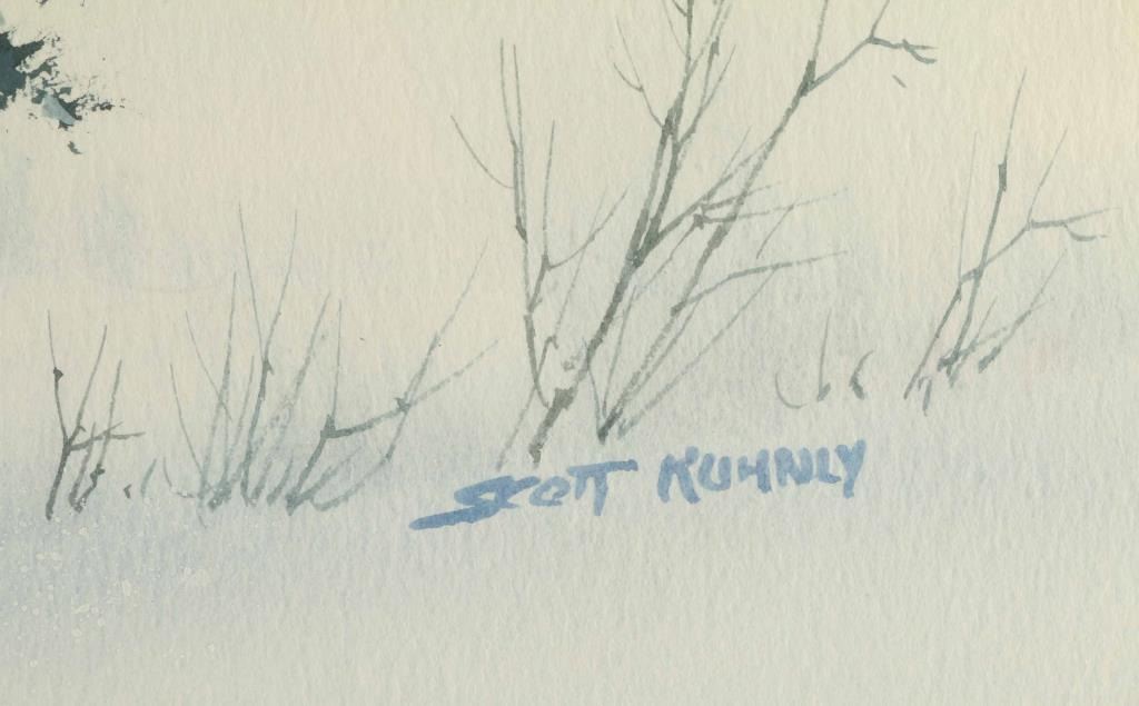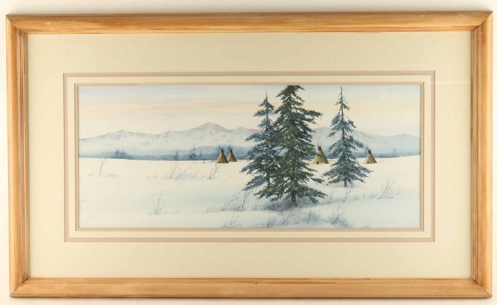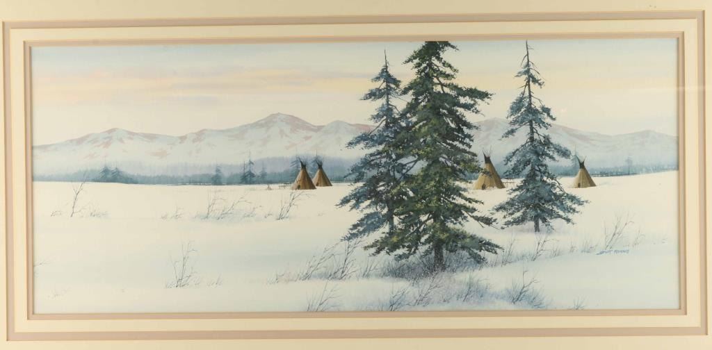 An untitled work by Scott Kunhly, this piece is signed in the middle of the right side an depicts a small Indian camp in the snow. Image measures 11" by 27" and is double matted and framed. BIO - Scott Kuhnly was born in Long Island, New York in 1939. He began his studies with artist Millard Sheets at the age of 10, knowing even at that young age he wanted to be an artist. From 1957 to 1964, Kuhnly majored in Art at California State University at Long Beach where he got his BFA and MFA. Kuhnly supported his family through sales of his art for over forty years by painting from his studio in Escondido, California. He was proud to say, "he has never had to have a real job", but got to do what he loves most (painting) daily at his studio. Kuhnly being an avid surfer in his youth and a vintage car enthusiast produced many seascapes featuring fishing boats, sail boats, and harbor scenes. He also painted of vintage automobiles in rural settings, as well as many California plein-air landscapes. Kuhnly chose watercolor and oil for preferred media.