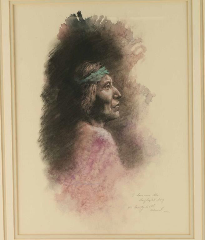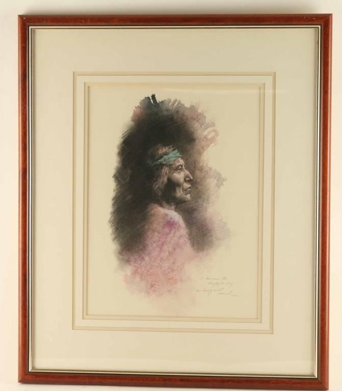 by Garner, depicts an indian profile, double and matted and framed. Measures 16"x12".