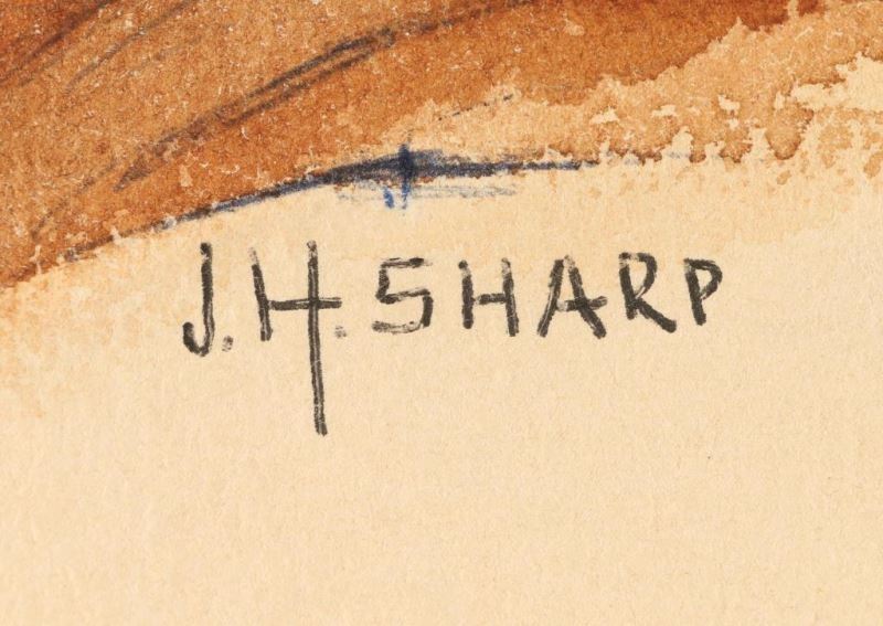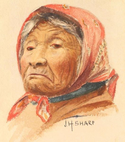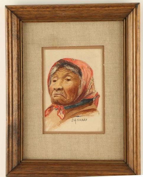 by noted artist by Joseph Henry Sharp image size 6.5"X5, matted in wood frame, hand signed in pen lower right hand corner depicts a Taos woman with red scarf. Born in Bridgeport, Ohio, Joseph Sharp was regarded as the "father of the Taos Art Colony," and was known for his Indian figure and genre painting as well as for exquisitely colorful landscapes. He was one of the first Caucasian artists to visit New Mexico, arriving in Santa Fe in 1883. He was also a visitor to Alaska, being one of the early artists who visited there after the purchase of the Territory. Although Sharp was completely deaf from a childhood accident, he reportedly had a cheerful nature and was an avid traveler, always seeking learning experiences about other cultures. From childhood he was interested in Indians, and at age fourteen, because of his deafness, left public school to study art in Cincinnati at the McMicken School and the Cincinnati Academy of Art. His studio was in the same building as that of Henry Farny who gave him books on Pueblo Indians. At age 22, Sharp went to Antwerp, Belgium where he studied with Charles Verlat, and two years later he began traveling the American West, going first on a sketching trip that included Santa Fe, places in California, and north to the Columbia River. He did numerous paintings of Indian figures to record their disappearing culture. In 1886, he returned to Europe for more study and enrolled at the Academy in Munich with Karl Von Marr. He also traveled with Frank Duveneck, famous Cincinnati artist, through Spain and Italy. From 1892 to 1902, he taught classes at the Cincinnati Art Academy, and from 1895 to 1896, attended the Academie Julian in Paris where he met Ernest Blumenschein and Bert Geer Phillips, who later joined him in Taos. In 1893, Joseph Sharp first went to Taos, and his sketches from that trip were published in Harper's Weekly. He began making summer trips West to sketch Indians, and in 1902, he painted in Arizona, California, Wyoming, and Montana. An admiring President Teddy Roosevelt had a studio built for Sharp at the Custer Battle Field site. From there Sharp traveled throughout the Plains to paint about 200 portraits of living Indians who had been in that battle. To achieve these paintings, he endured much severe weather and physical hardship. By 1912, Sharp was a permanent resident of Taos, living across from Kit Carson's homesite and painting many of the Pueblo Indians in their daily activities. His longtime close friend and model was Jerry (Elk Foot) Mirabal, who, dying in 1980, lived to be 110. Sharp continued to travel, going frequently to Hawaii and California during the winters where he completed numerous floral landscapes. He also stayed in close touch with his hometown of Cincinnati, where he relied upon friends in the Cincinnati Art Museum for canvas and certain types of paint, and in December, 1915, he held the first of fifteen annual Christmas exhibitions there. He died in Pasadena on August 29, 1953. His Indian paintings are prized for their detailed accuracy, and many of them are in the collection of the Department of Anthropology at the University of California, Berkeley.