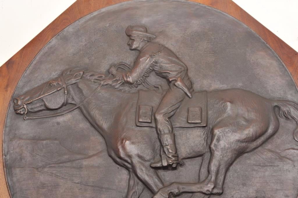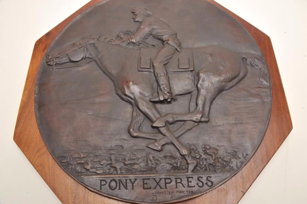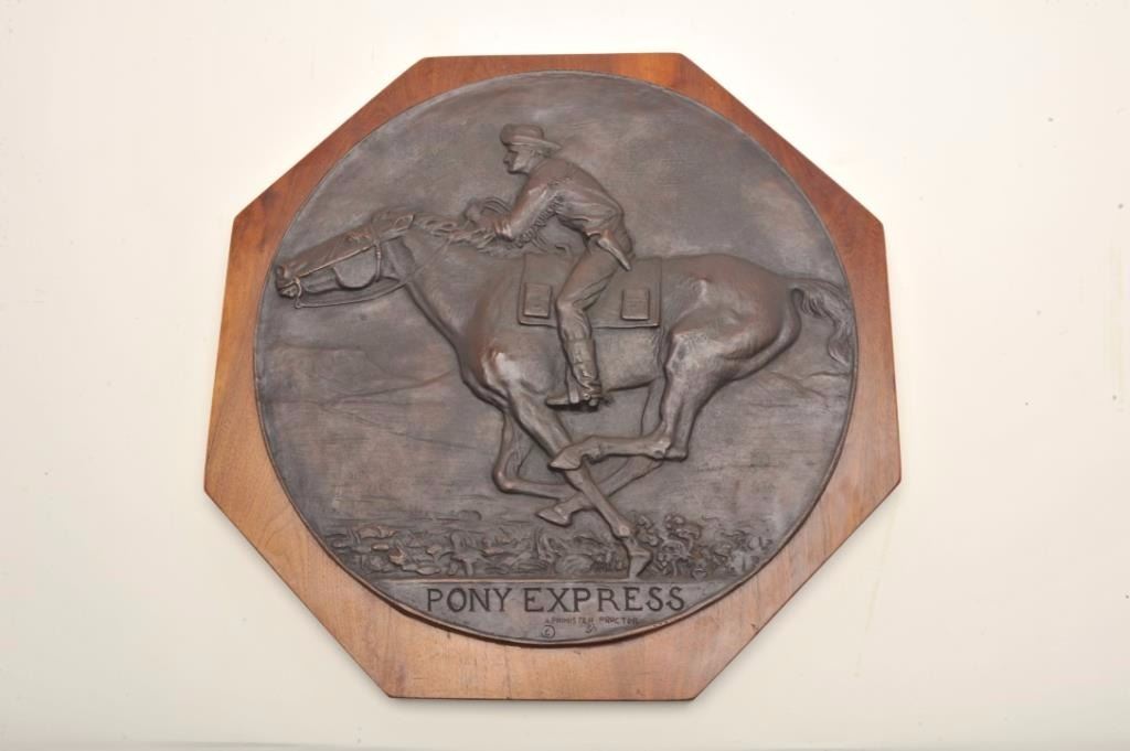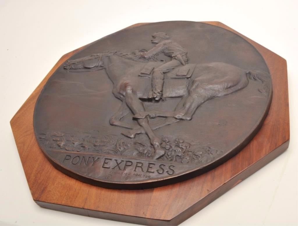 Original bronze on plaque of Pony Express rider on mount. Signed “A. Philmister Proctor”. Measures approximately 19 ½” not including wood mounting. Est.: $1000-$2000