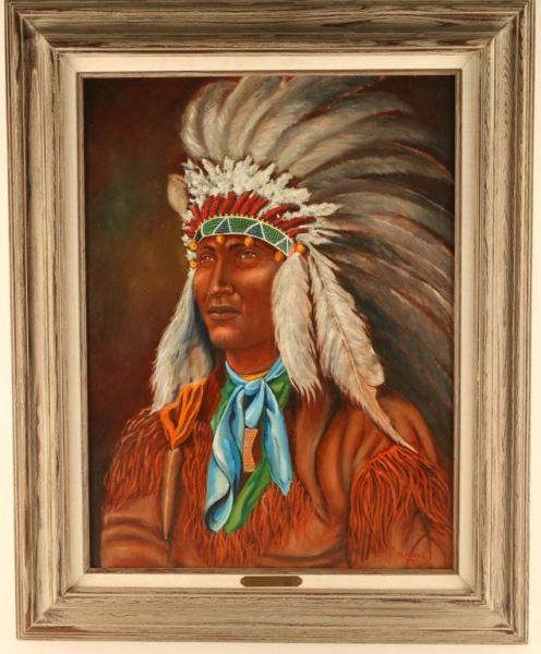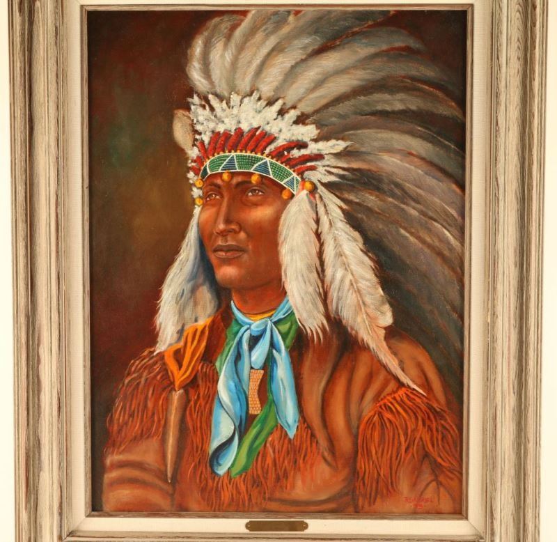 by R. Gabriel entitled Chief White Cloud, in barnwood frame, measures 17"X24"