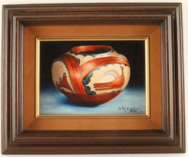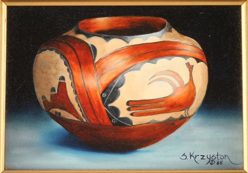 by S. Kryston dated 1985 and hand signed lower right of Stillife indian pot measures 7"x5".