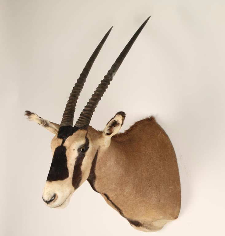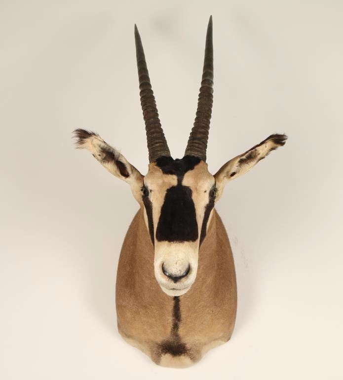 Measure 33" from shoulder to wall, horns 29" long. A large African antelope, Oryx gazella, grayish with black markings and having long, nearly straight horns.