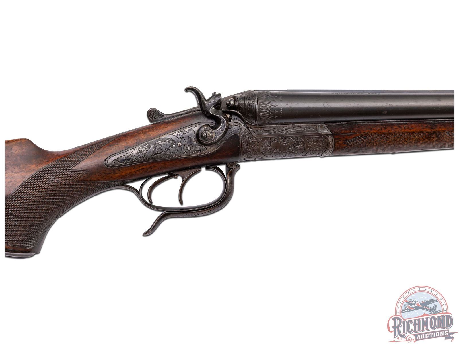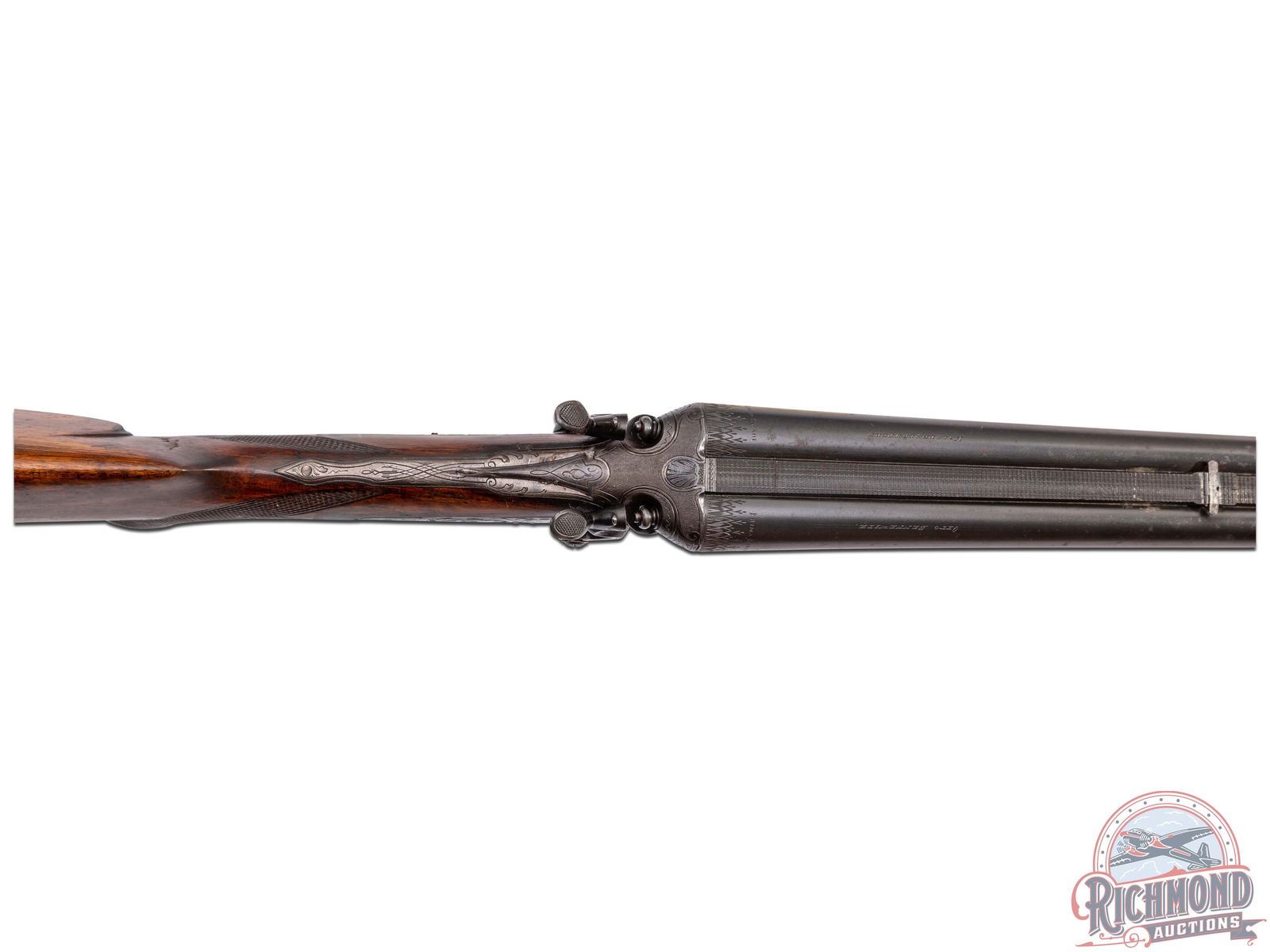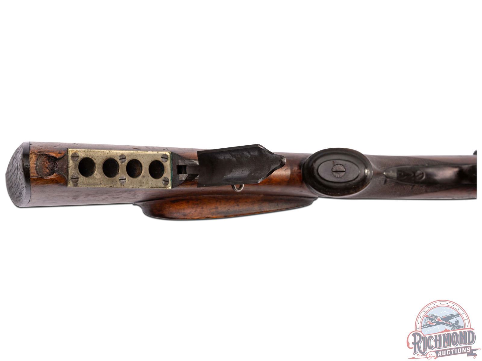 Made in Germany by Otto Bennewitz, circa 1910. 27-1/4" maker marked blued Krupp steel barrels with ventilated rib, rifle sights, extractors, and 16 by 16 gauge barrels over 9.3x72R rifle. Round game scene engraved case-hardened underlever action with exposed hammers, and double triggers (front is set). Action and lock plate are engraved with deer, rabbit, and bird scenes. Rifle has top lever barrel selector and underlever opener. Walnut checkered pistol grip stock with engraved steel bullet trap and horn butt plate. Matching checkered splinter forearm with latch release. LOP: 13-1/4". DAC: 1-1/4". DAH: 2-1/4". CALIBER: 16x16/9.3x72R. S/N: 4214. FFL STATUS: Curio & Relic.