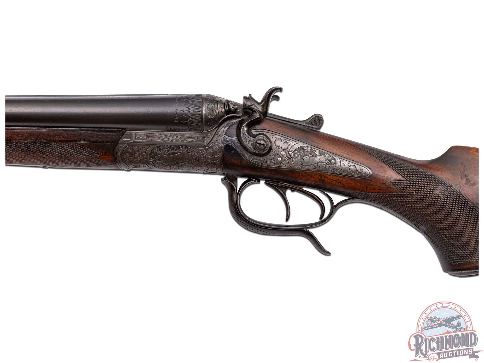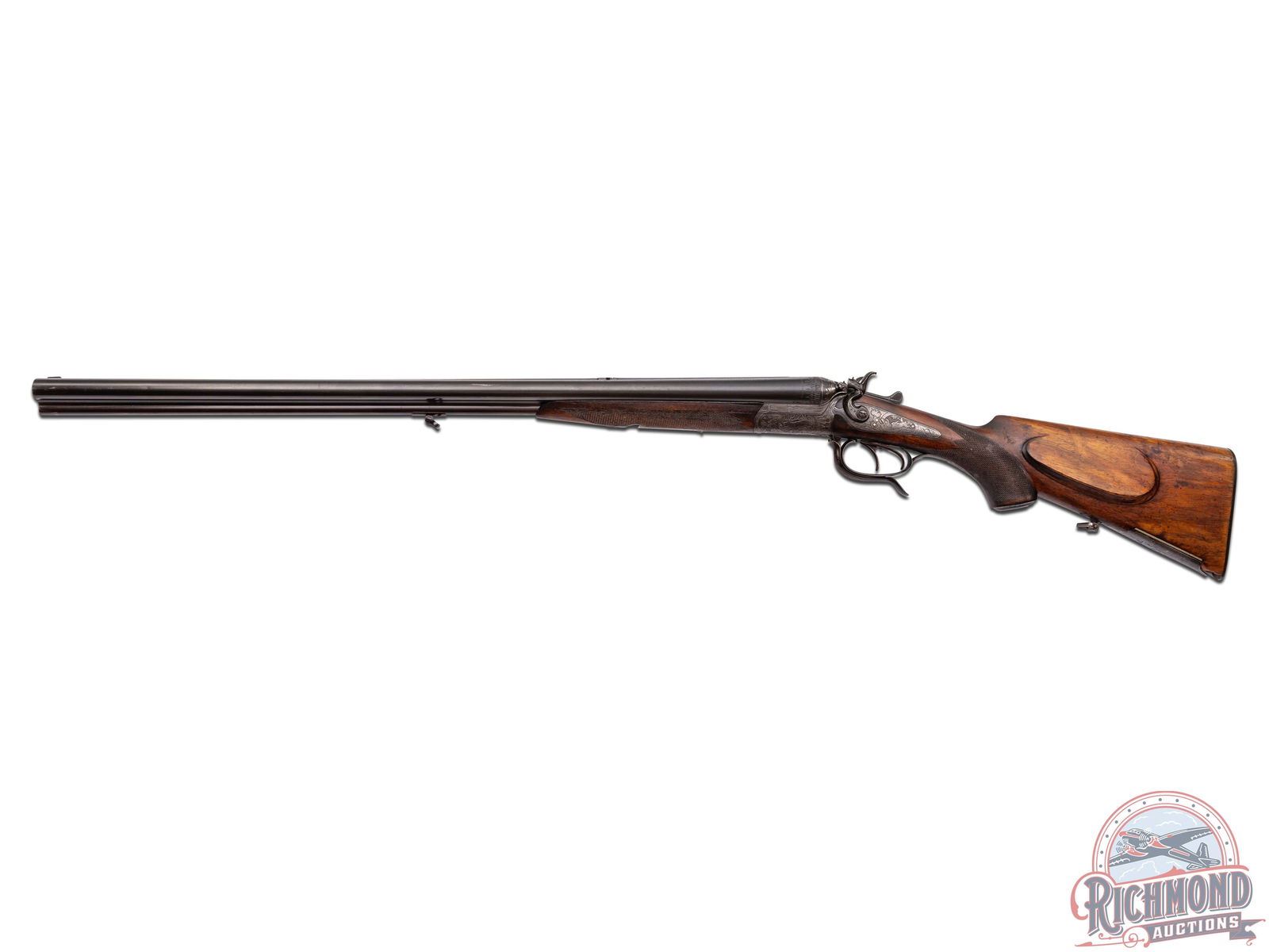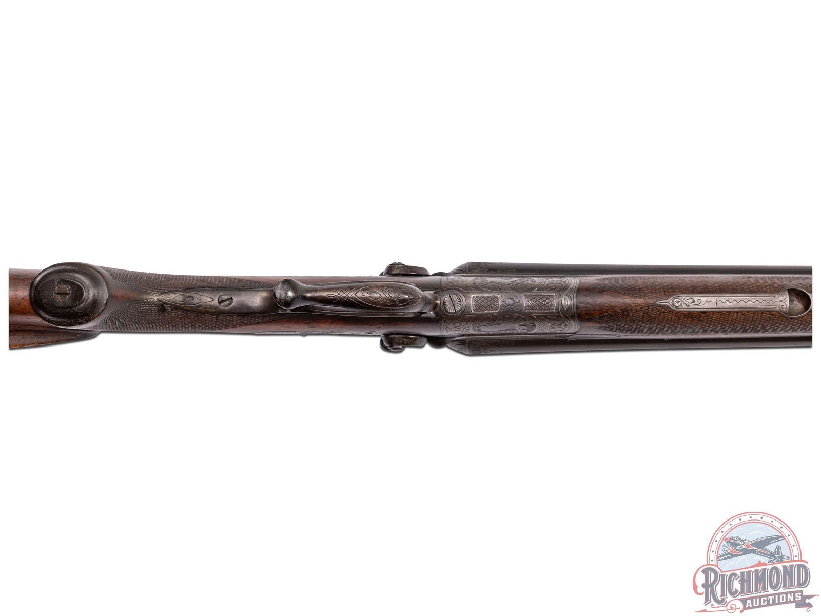 Made in Germany by Otto Bennewitz, circa 1910. 27-1/4" maker marked blued Krupp steel barrels with ventilated rib, rifle sights, extractors, and 16 by 16 gauge barrels over 9.3x72R rifle. Round game scene engraved case-hardened underlever action with exposed hammers, and double triggers (front is set). Action and lock plate are engraved with deer, rabbit, and bird scenes. Rifle has top lever barrel selector and underlever opener. Walnut checkered pistol grip stock with engraved steel bullet trap and horn butt plate. Matching checkered splinter forearm with latch release. LOP: 13-1/4". DAC: 1-1/4". DAH: 2-1/4". CALIBER: 16x16/9.3x72R. S/N: 4214. FFL STATUS: Curio & Relic.