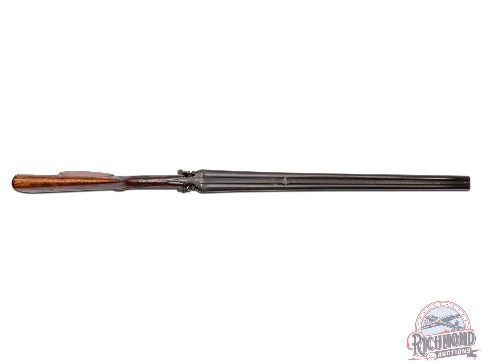 Overall 90% of an old barrel reblue remains with edge wear and some usage scratches. Action has faded to a silvery patina. Wood has traces of finish with scratches and dings with a toe wound. Good bores and mechanics with set trigger out of adjustment.