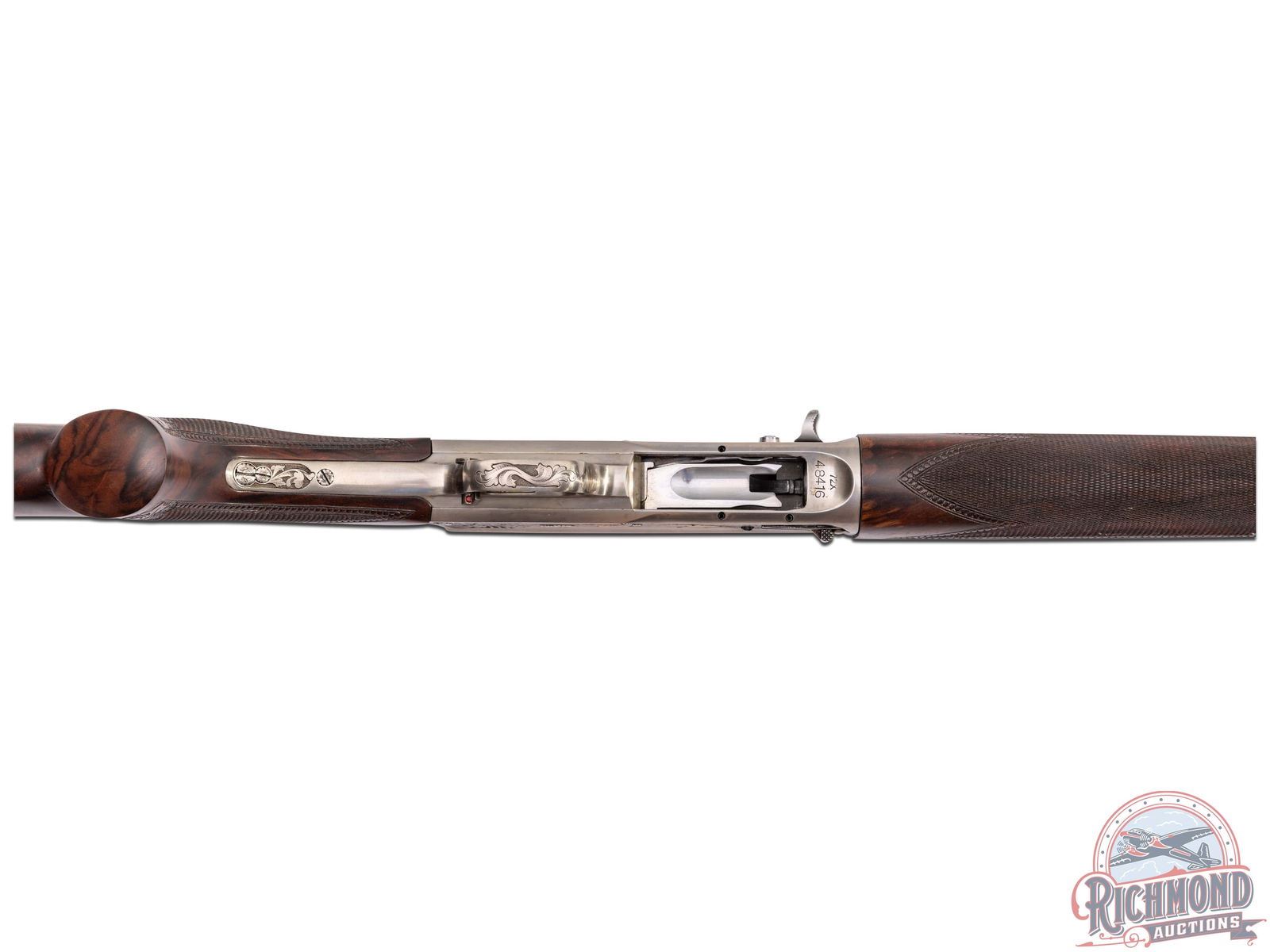 Made in Herstal, Belgium by Browning in 1972. Very little information is available on this gun and it might be a special ordered custom shop gun. 25-1/2" blued Special Steel barrel with Modified choke, 3" chambers, ventilated rib, and bead front sight. Barrel is marked with Browning St. Louis and Montreal addresses. Satin finish action with floral engraving and 3 gold flying quail on right and 3 gold flying ducks on top with 3 flying ducks and 2 flying pheasants in gold on left with engraver's signature "P. Lallemand". Fine Circassian walnut pistol grip stock with checkered grip with floral and chain engraved border. Stock is fitted with Browning butt plate. Matching walnut checkered forearm with floral and chain carved border. LOP: 14-1/4". DAC: 1-1/2". DAH: 2". CALIBER: 20 GA. S/N: 72X48416. FFL STATUS: Curio & Relic.