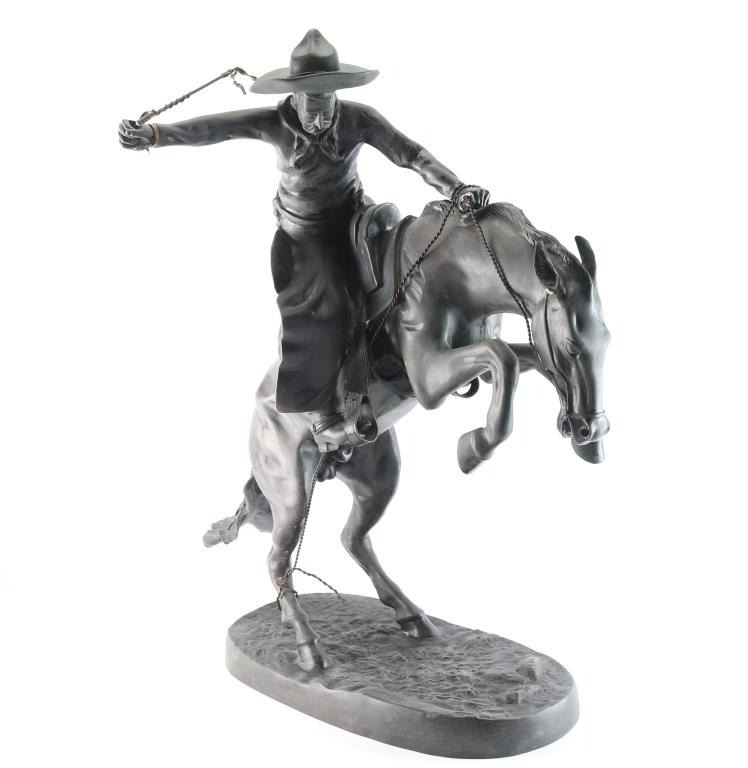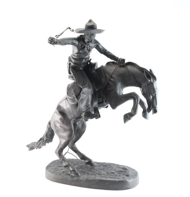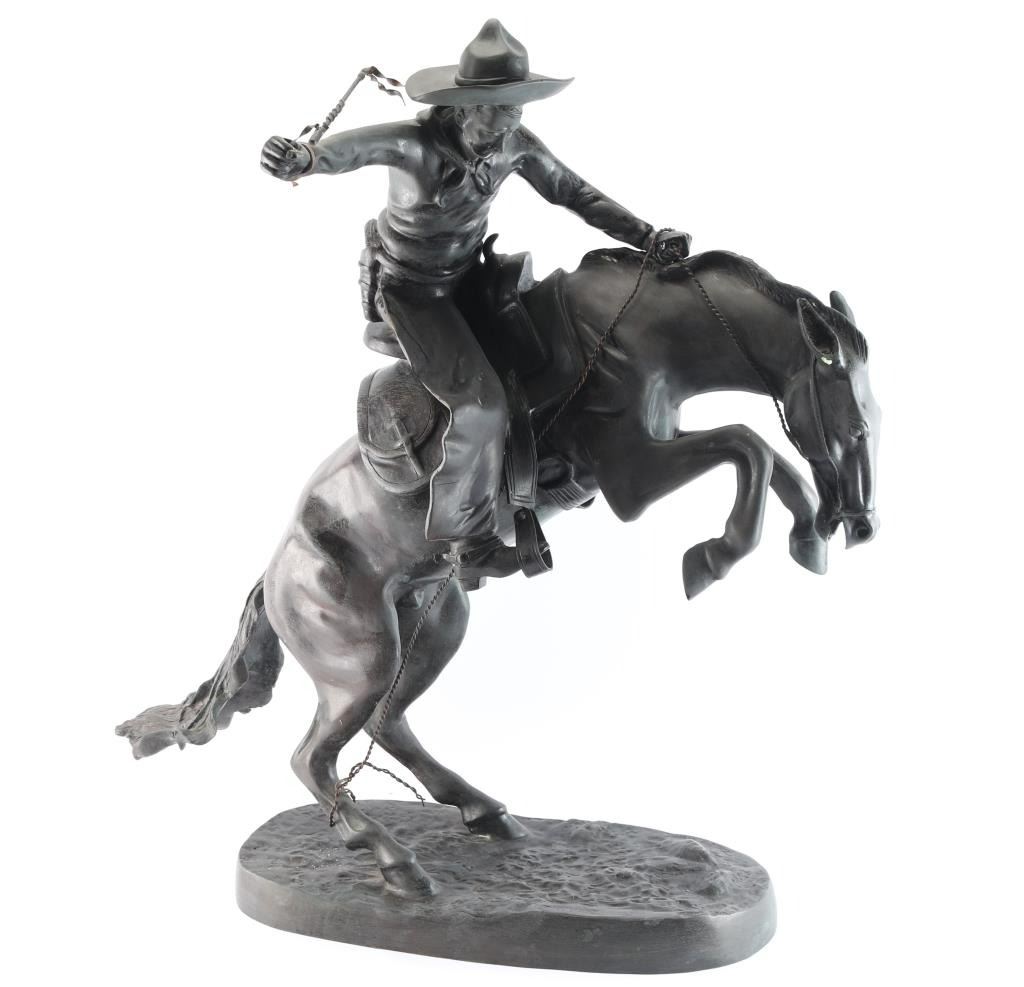 Restrike. Depicts cowboy on horseback. Measures 31" x 20" x 10". LOCAL PICKUP ONLY!