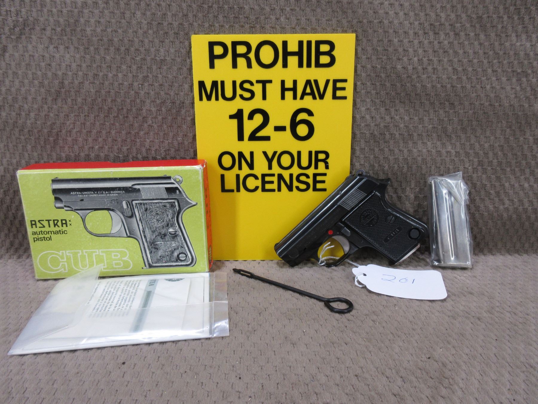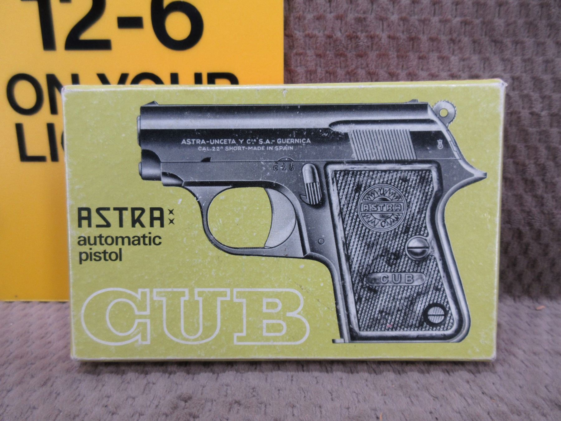 PAL must have 12-6 Handgun on it to Purchase this Prohib Firearm CHECK BEFORE BIDDING - Astra Cub Semi-Auto Pistol in 22 Short -This magazine feed semi-auto pistol is new in box, never fired. Barrel is 54MM, has fixed sights, comes with original box, cleaning rod, extra magazine and manual, Ser # 183741