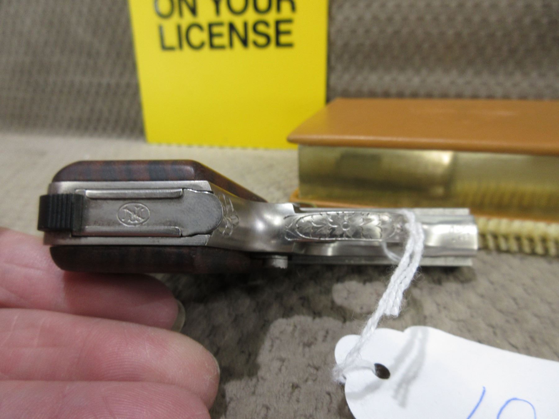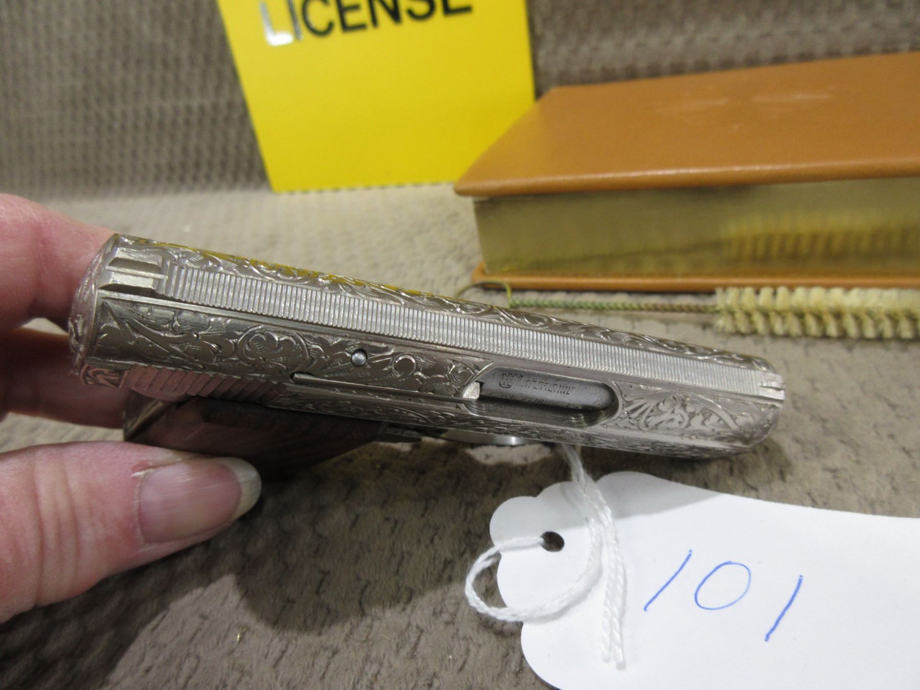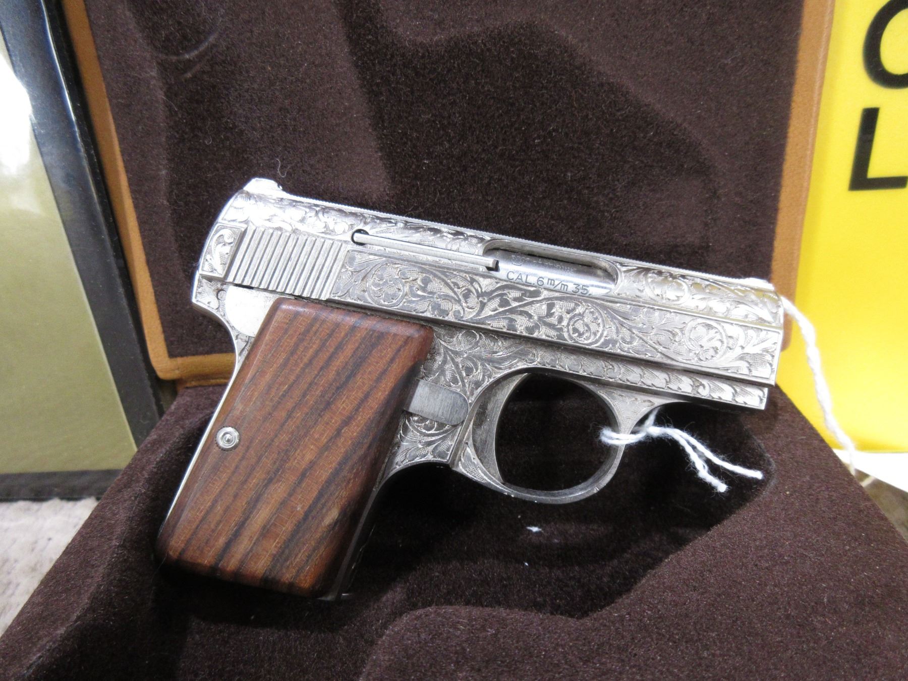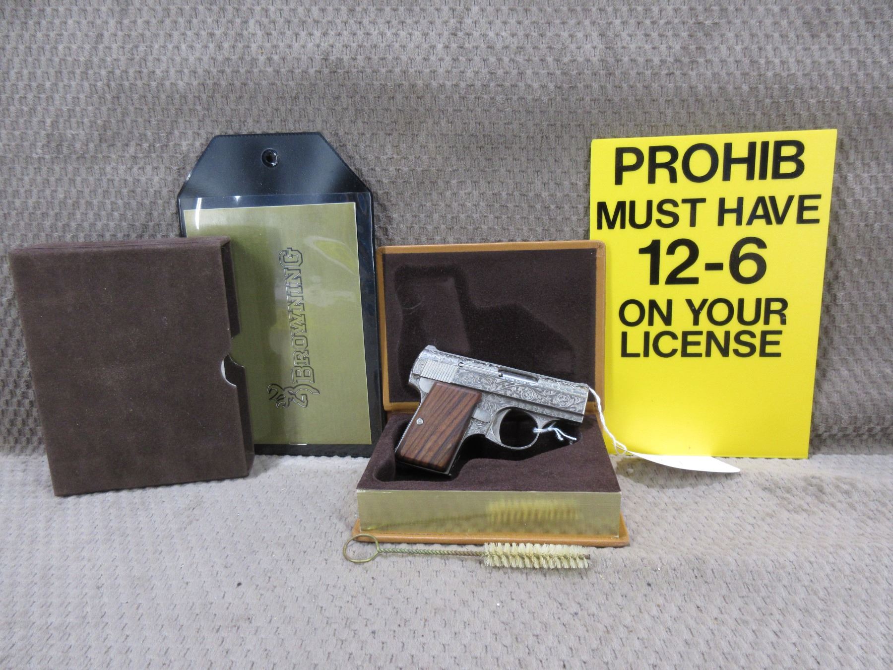 PAL must have 12-6 Handgun on it to Purchase this Prohib Firearm CHECK BEFORE BIDDING - Browning Baby Semi Auto Pistol 25ACP in 6.35mm - This magazine feed semi-auto pistol is new in box, never fired. Barrel is 51MM, silver finish is highly engraved, has fixed sights, comes with original bible box, cleaning rod, bible case and manual, Ser # 205RN1171