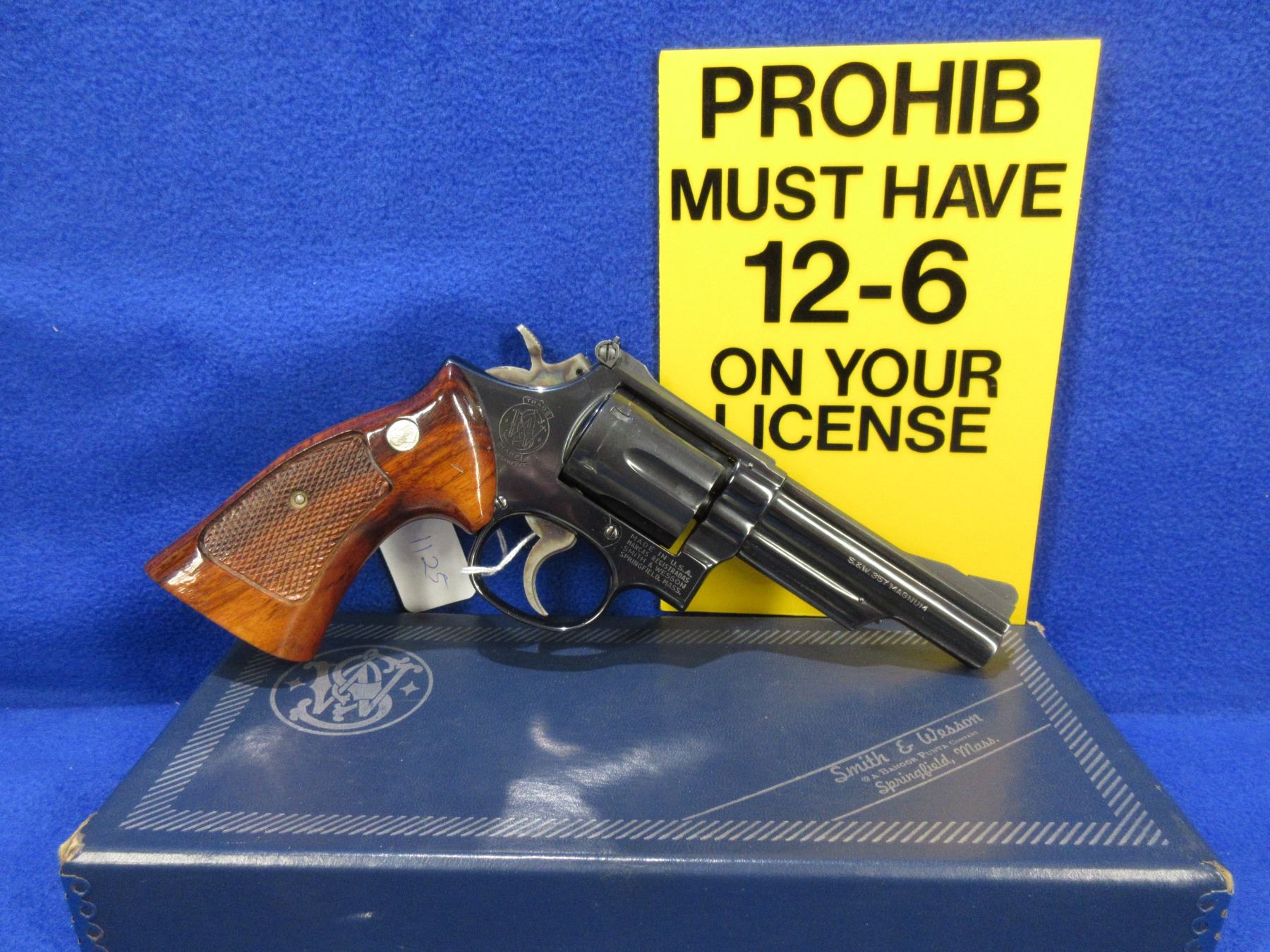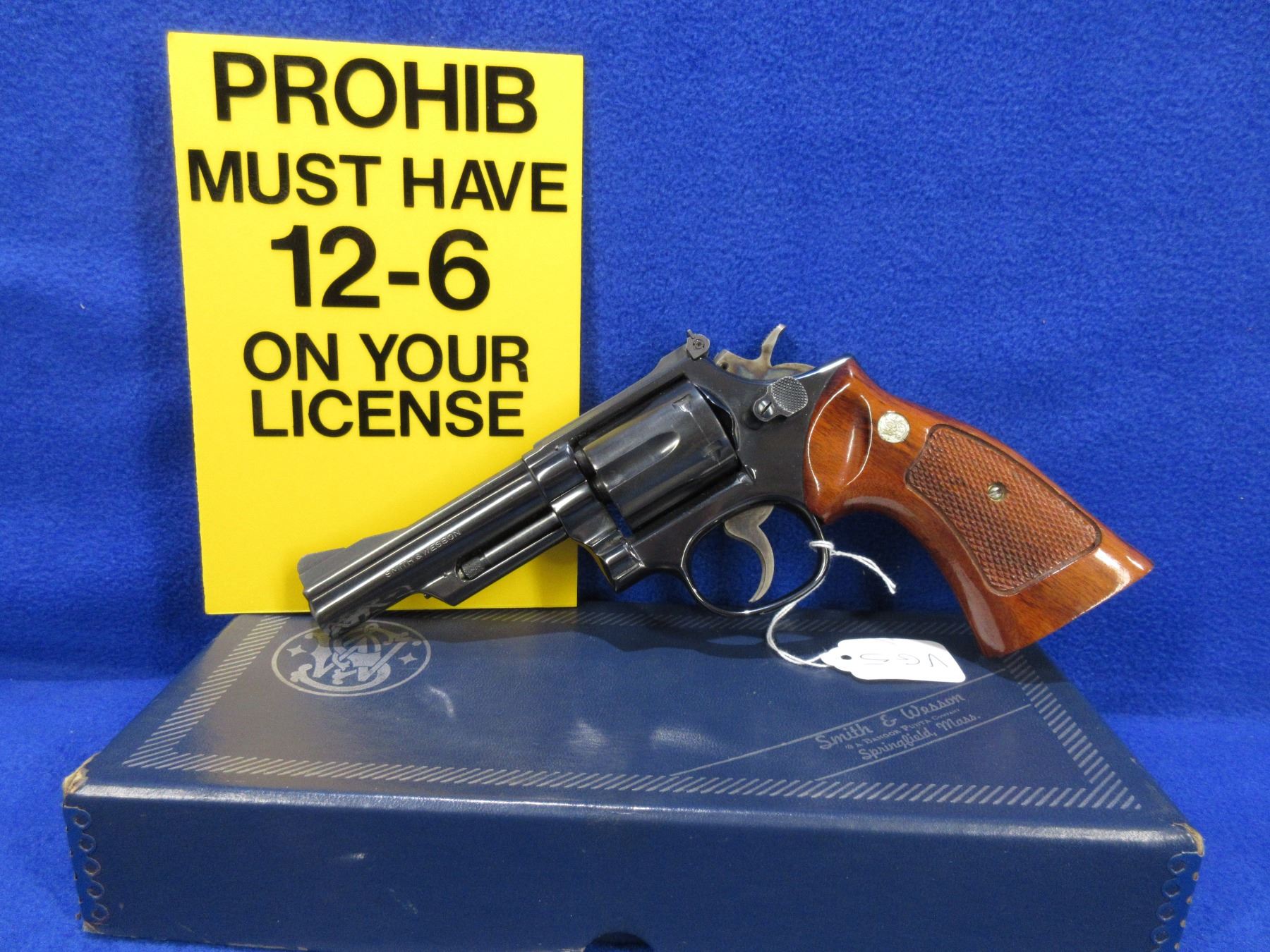 PAL must have 12-6 Handgun on it to Purchase this Prohib Firearm CHECK BEFORE BIDDING - Smith & Wesson Model 19-4 in 357 Magnum - This 6 shot revolver appears to be in very good working order. Barrel is 101MM, rifling is very good, bluing is very good, has fixed front sight, adjustable rear sight, wood grips are very good, comes with original box. Ser # 44K9459
