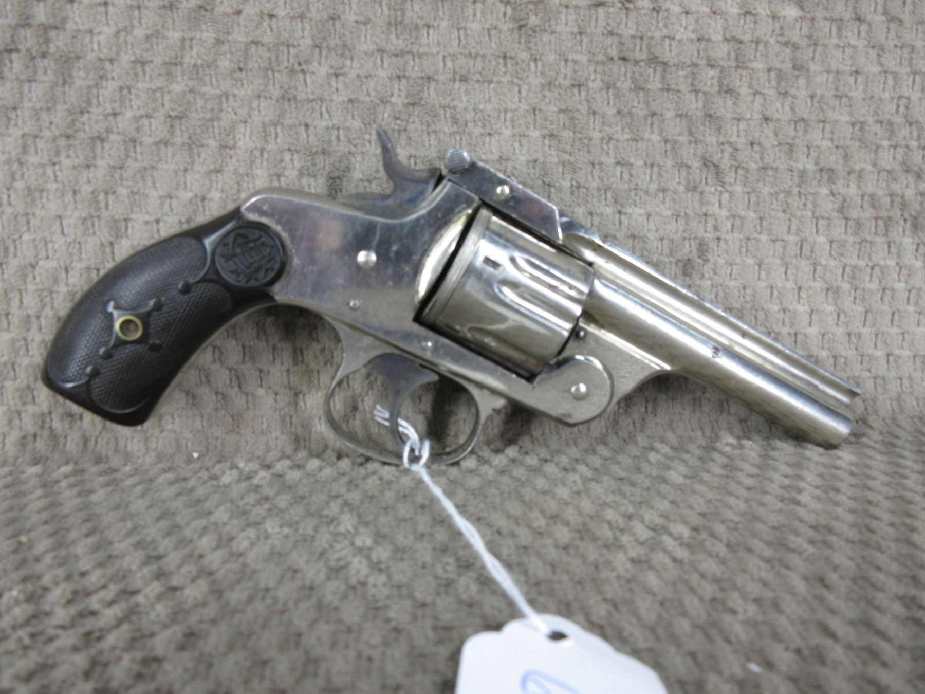 PAL must have 12-6 Handgun on it to Purchase this Firearm - Prohib - American Arms Top Break in 38 S&W - This double action 5 shot hammer revolver is in non working order as cylinder spins freely. Barrel is 83MM, nickel plating is fair to good, rifling is fair, missing front sight, left grip is missing piece, right grip is good.