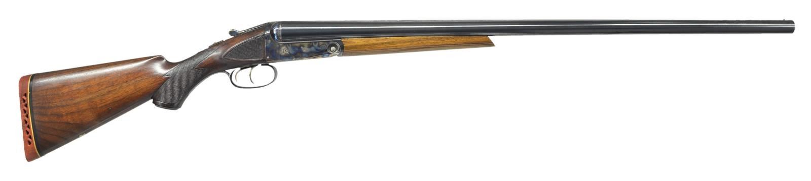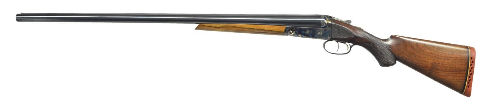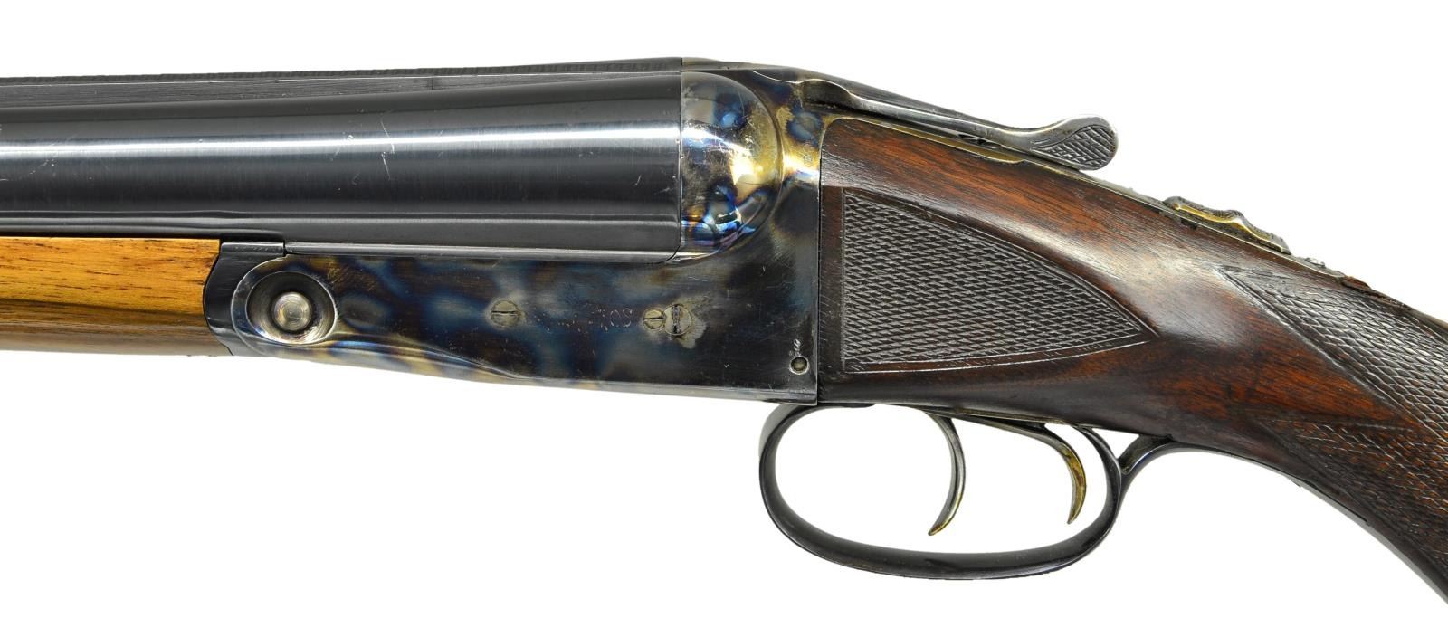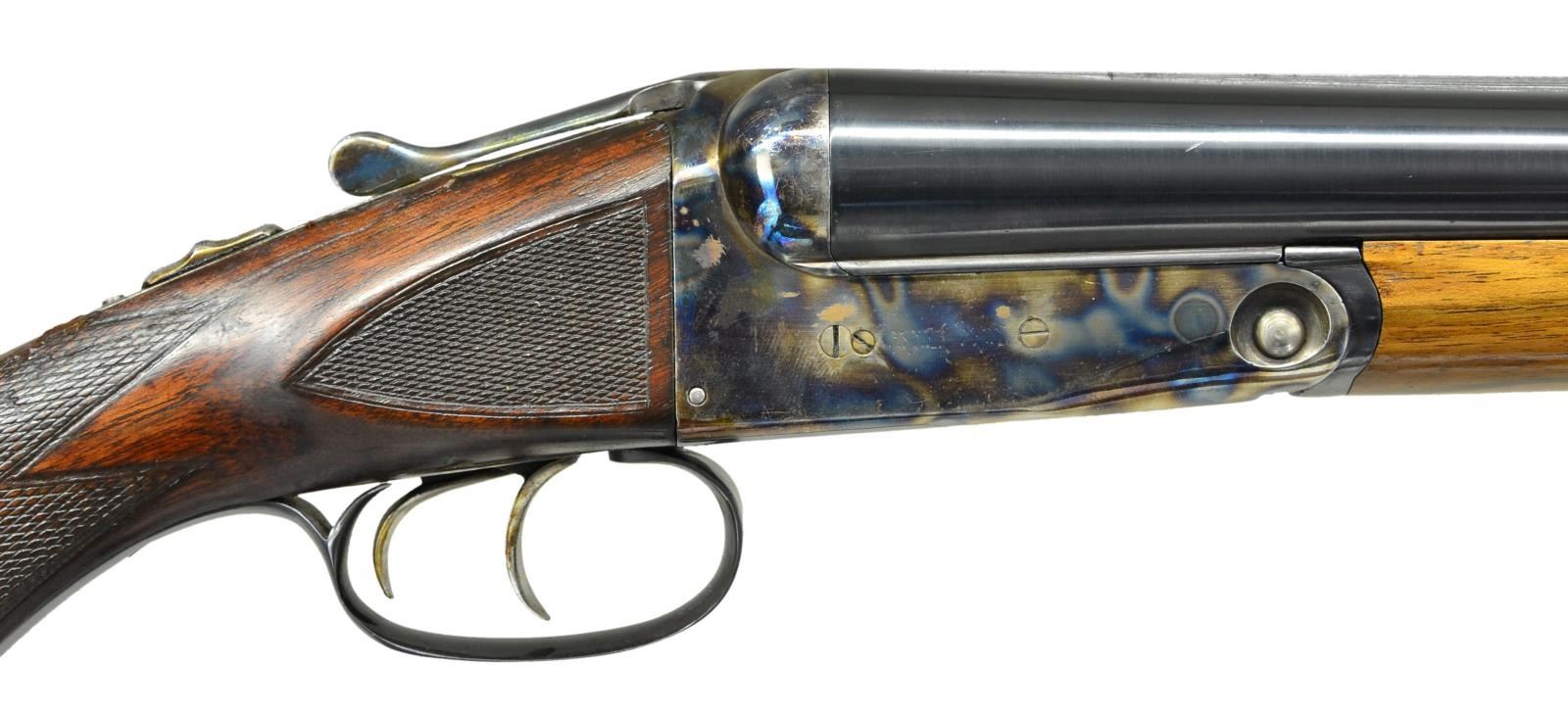 Cal. 12 Ga, S# 185996 (1919). Trojan Steel 28" bbls. w/ matted raised rib & bright bead. IC & Mod chokes. Chambers appears reamed open. Boxlock action w/ dbl. triggers, extractors & automatic safety. Replacement walnut forearm & original pistol grip walnut stock w/ Parker Bros grip cap, German silver shield on toeline, checkering at wrist & ears. LOP: shortened to 12 7/8" over red ventilated pad. CONDITION: very good reblued bbls. w/ sm. dents in rib, handling marks & pinprick oxidation. Receiver has re case hardened finish mostly obscuring Parker Bros markings w/ fading finish on floorplate, edge wear, spots of peppery oxidation & handling marks. Very good forearm finish w/ a few marks; latch is frozen in place & will not free forearm from bbls. Lightly sanded & refinished buttstock has large repaired break at top of wrist having noticeable chip missing, recut checkering at ears, smoothed checkering at wrist along w/ light handling marks & sm. chips. Good shiny bores show numerous sm. dents in both tubes. (23-981/MD). MODERN. $400-600.