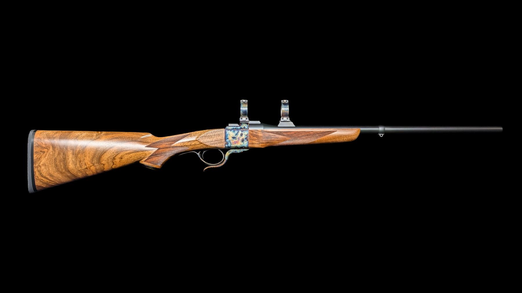 Includes an adjustable trigger, ambidextrous tang safety, case hardened finish with custom engraving, and 23" premium grade carbon steel barrel with front band and rear sling swivel. No expense was spared on the wood with XXX Walnut with a hand rubbed oil finish. LOP comes in at 13 5/8".